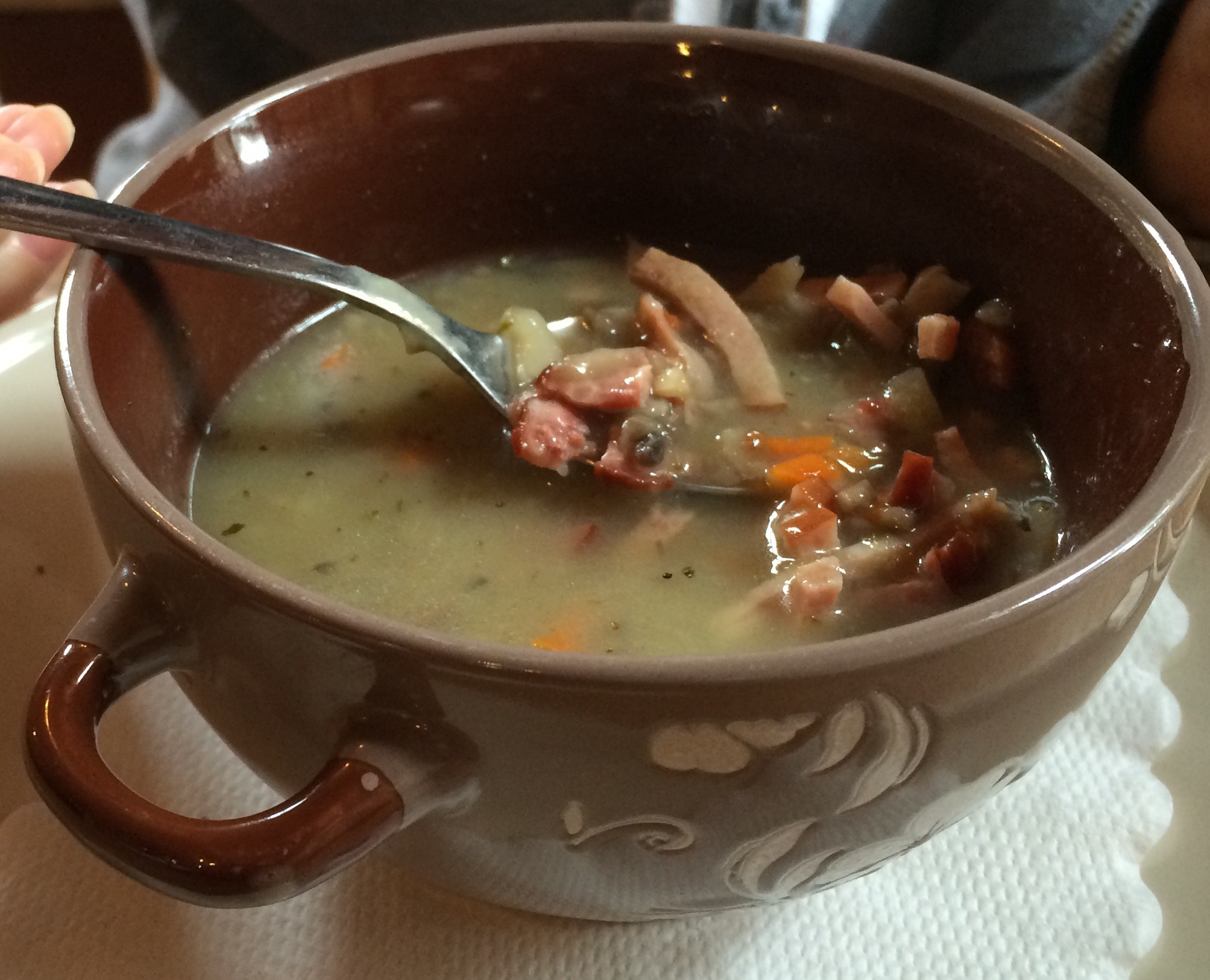 Farsz w pierogach doprawiony i smaczny – tak były dobre to trzeba im przyznać. Zupa gorąca i treściwa – z szynką, boczkiem oraz kiełbasą – również smaczna.