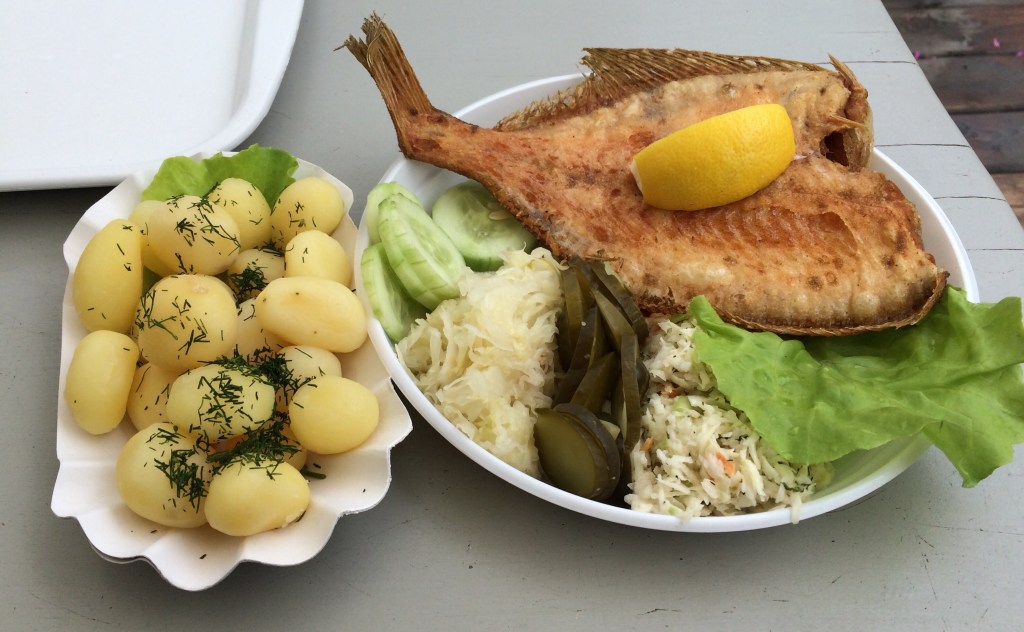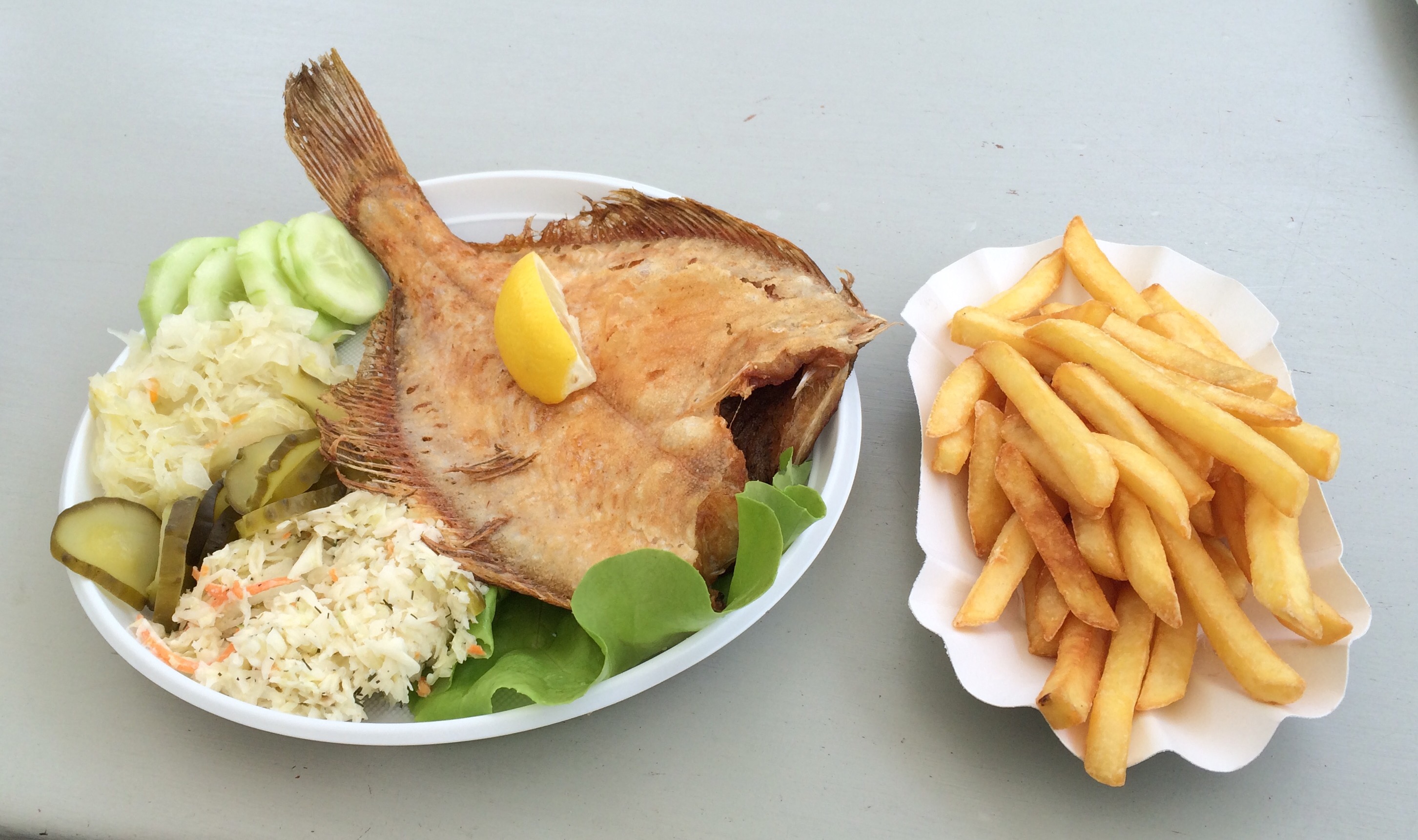W menu rybnym flądra za 5.5PLN/100g dodatkowo sola, łosoś i pare innych w trochę wyższych cenach. Pani poleciła tą pierwszą mówiąc, że świeża, tutejsza, bałtycka. Uwierzyliśmy i dobraliśmy po zestawie surówek 6PLN oraz ziemniaki gotowane i frytki 5PLN. Jak ktoś koniecznie uparłby się na mięso to był też zestaw ze schabowym lub piersią z kurczaka za ok 18PLN. Napoje 0.5l za 5 zeta. Soki cappy i puszki pepsi/cola 4PLN