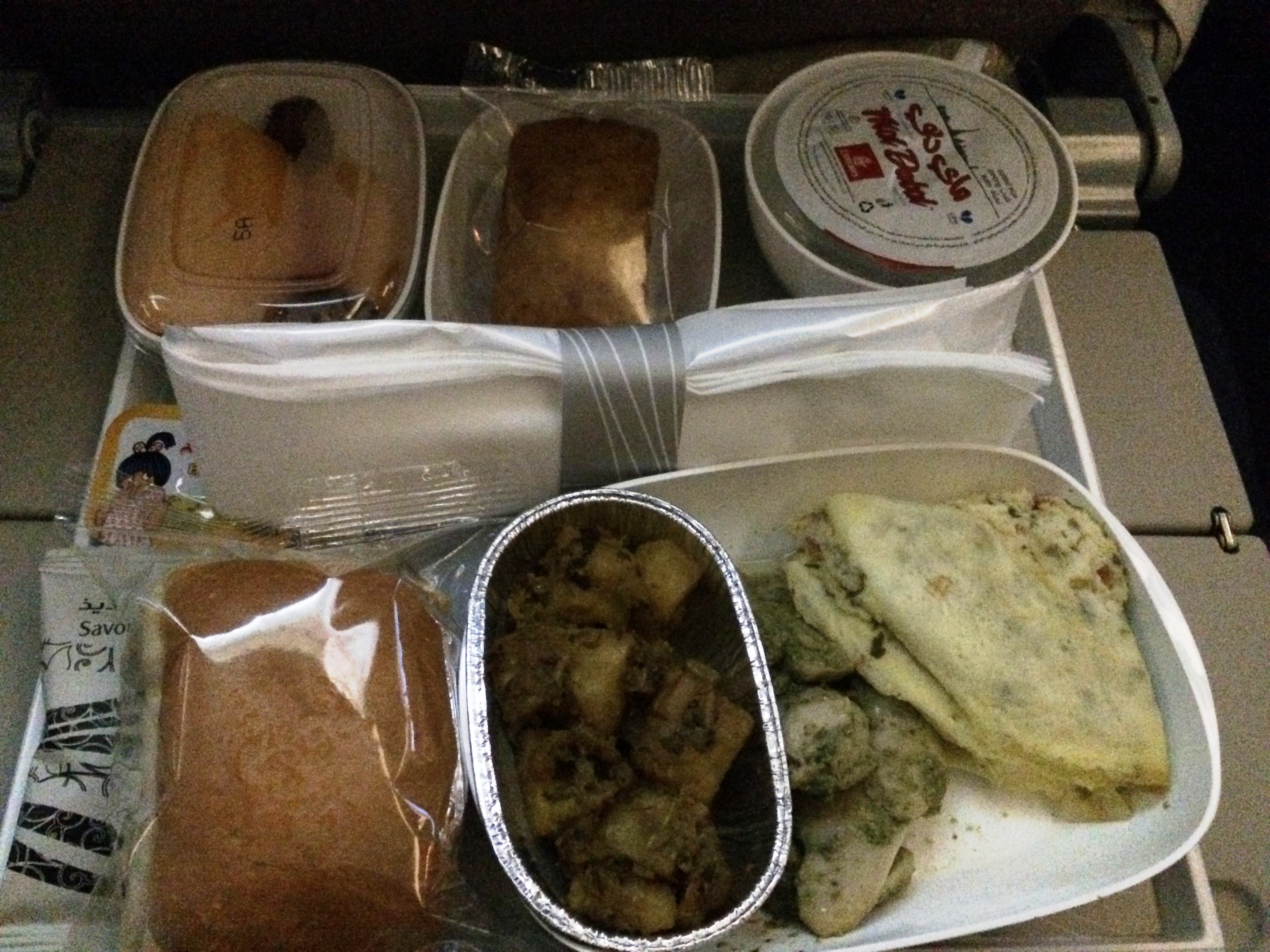 Siedzenia niestety wąskie i przez to było niewygodnie. Ciągle z gościem obok się szturchaliśmy. Na śniadanie był jakiś hinduski omlet i mięso. Jak tylko tego spróbowałem i poczułem masalę to od razu odstawiłem. Pożywiłem się serkiem i bułeczką oraz owocami. Podróż nie minęła już tak szybko jak pierwszy odcinek, zmęczenie dawało się we znaki.