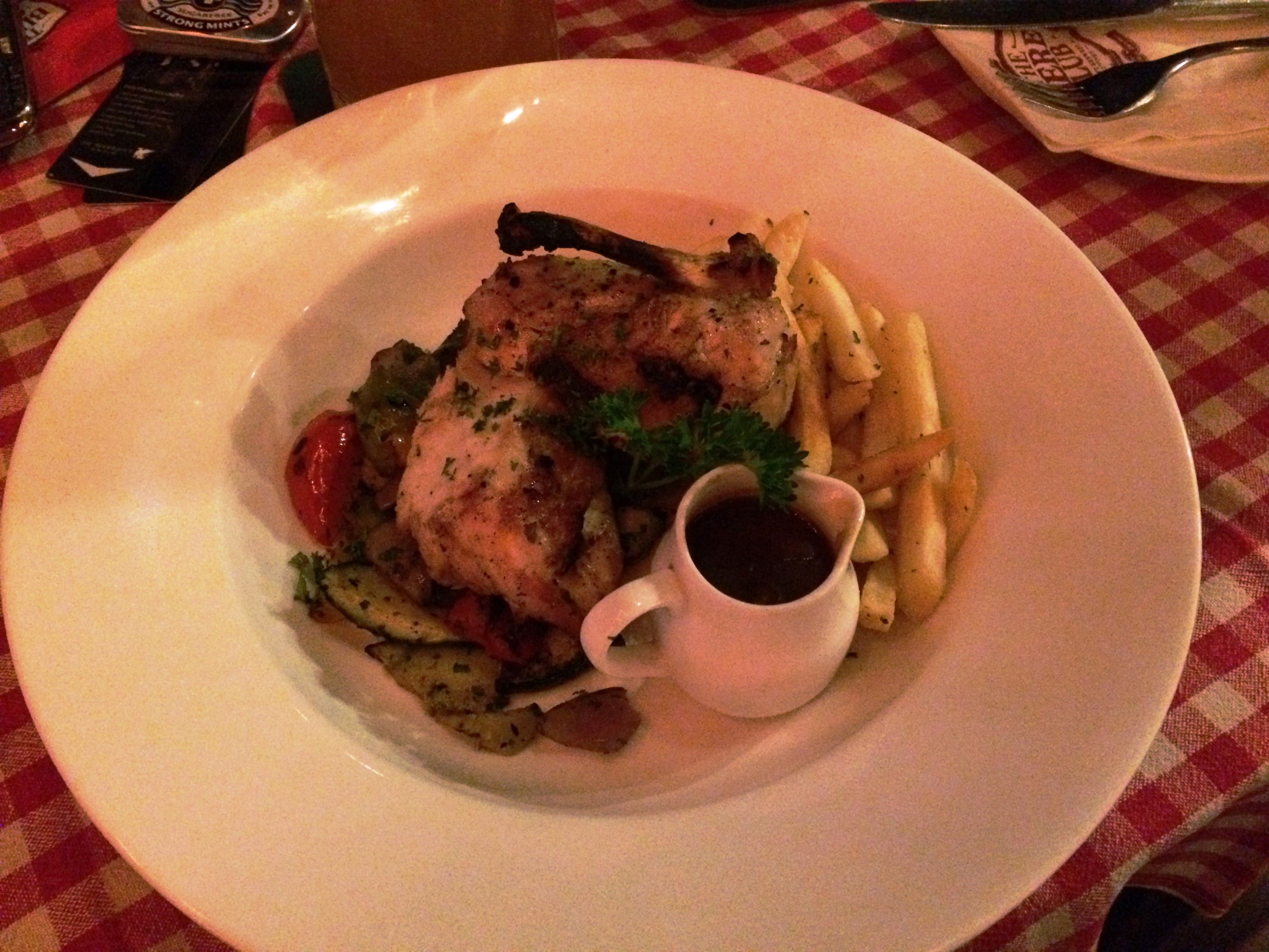 Zacznę od siebie. Pierś pochodziła od ewidentnie małego kurczaczka, ugrillowana z kością ze skrzydełka. Smaczna, dobrze zrobiona, bez indyjskich przypraw czy dodatków, ale też nie pieściła specjalnie podniebienia. Frytki jak frytki w sumie średnie, bez odchyłek. Do tego zestaw warzyw z grilla posypanych pietruszką. Dodatkowy sos, którym całe szczęście nie polałem całego kurczaka tylko dałem niewielką ilość na bok talerza, okazał się oczywiście sosem na bazie mojej „ulubionej” masali . Pikantny i po indyjsku aromatyczny. Paskudny. Danie oceniam w skali do 10ciu na 5 i więcej bym go nie zamówił – nie powaliło mnie w żadnym aspekcie. Cena – około 40PLN.