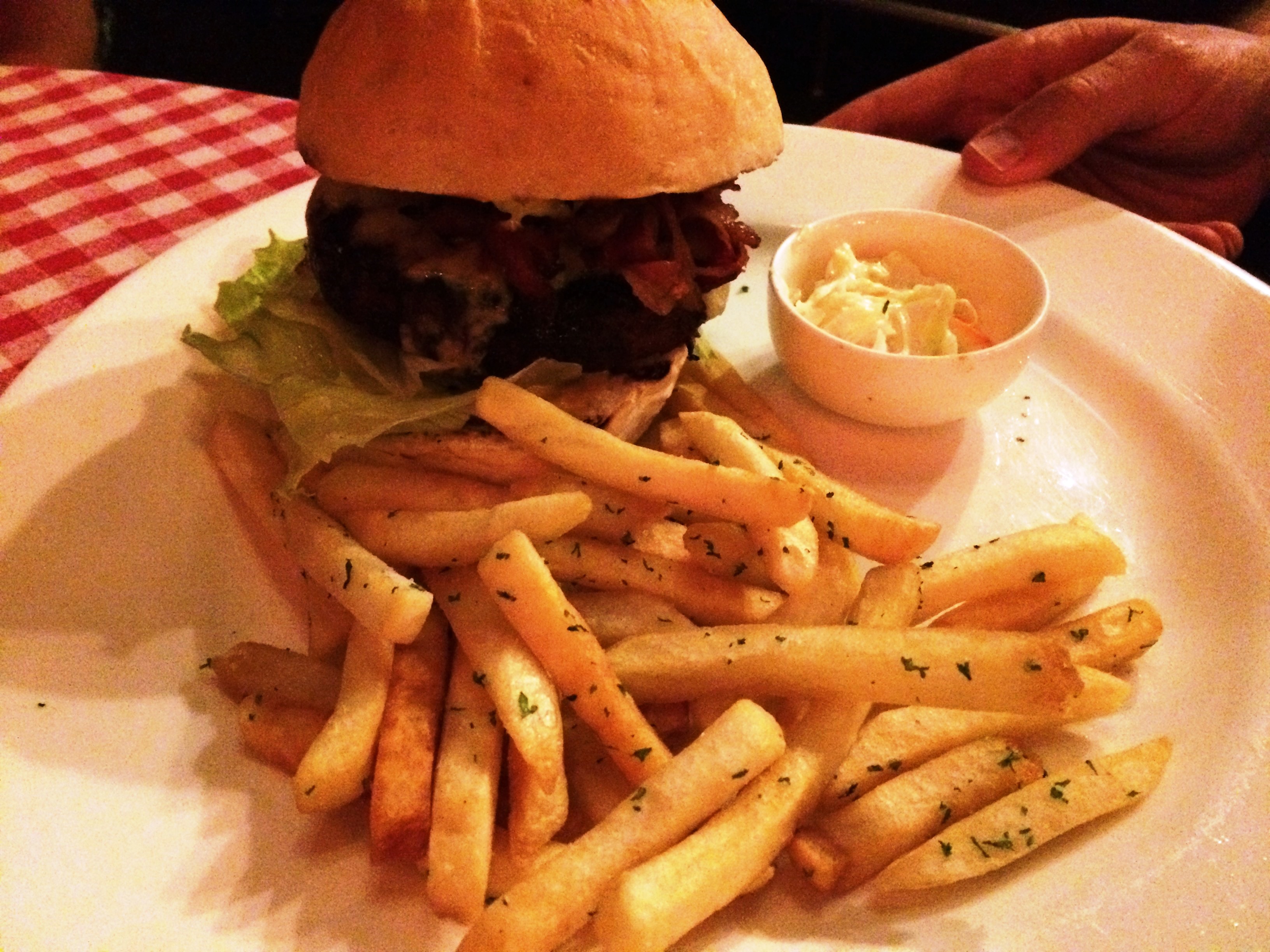 Szukałem czegoś nie smażonego, więc wybrałem pierś z kurczaka z grilla z ryżem (dostałem frytki), A. zamówiła veggie burgera, T. wołowego burgera z bekonem i frytkami.