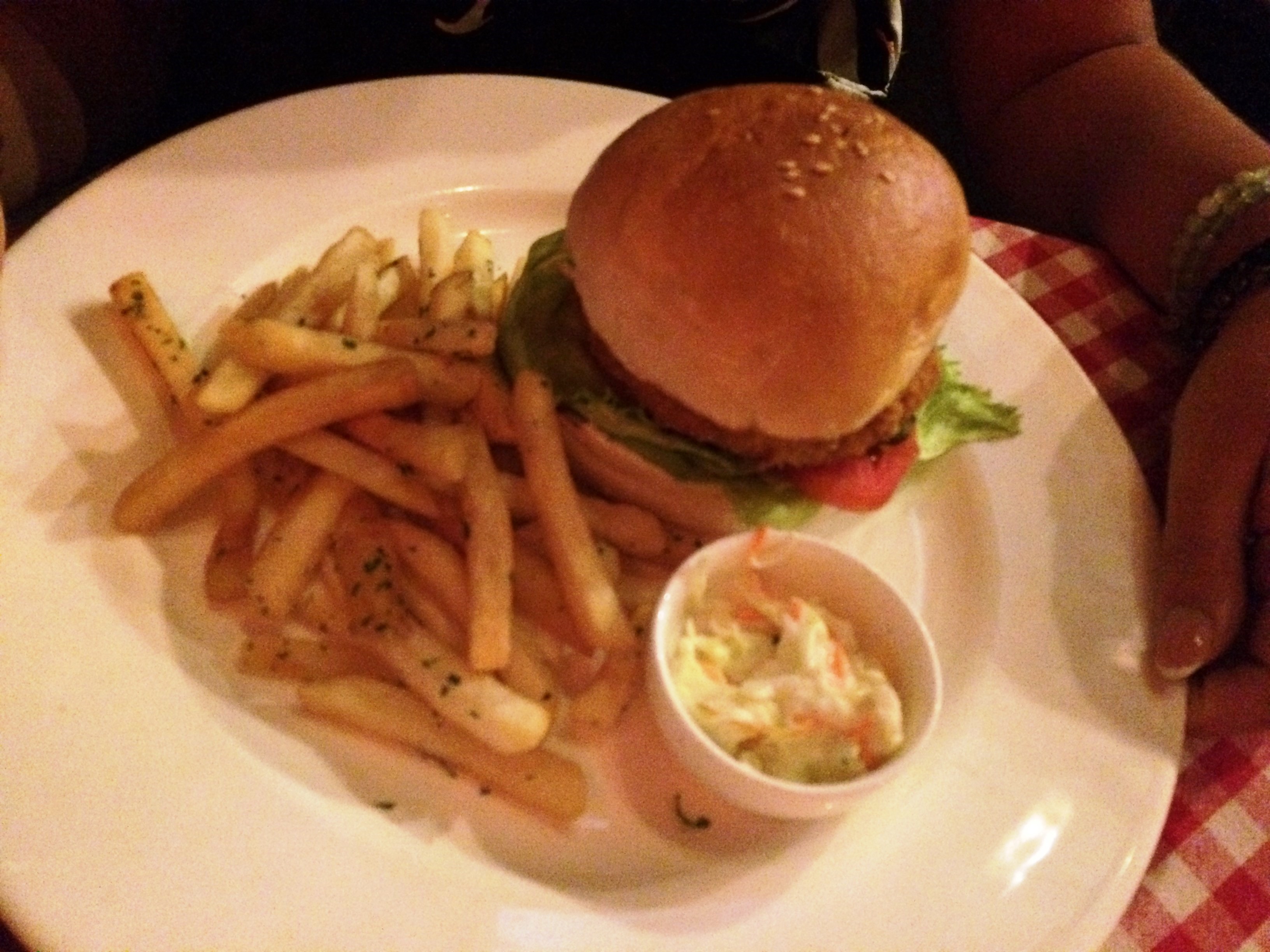 A. veggie burger – no cóż – samo veggie i burger – jakoś nie widzę jak te dwa słowa mogą iść w parze. Na pewno należy się Jej szacun za odwagę przy zamówieniu takiego tworu, ale z komentarza wiem, że smakowo nie spełnił oczekiwań. Zgodziliśmy się wspólnie co do Colesław’a że był smaczny – troszkę inny niż nasz polski bo słodkawy.