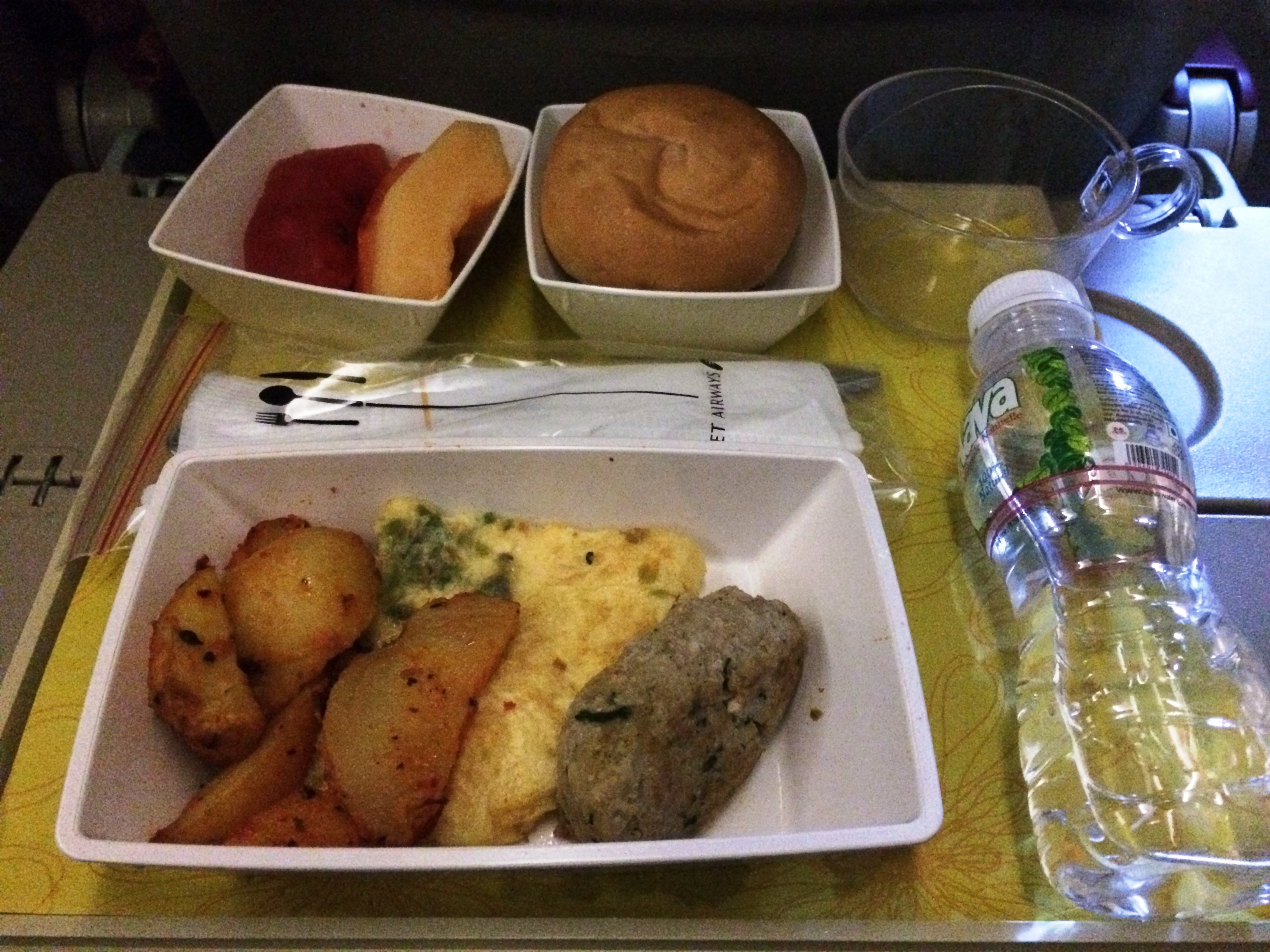 Airbus a330-200 w ustawieniu 2-4-2. Dobre ekrany TV z własnym sterowaniem. Na kolacje tortilla wegetariańska – nie próbowałem. Śniadanie 4h później składało się z omletu z bliżej nieokreślonym kurczakiem – dla mnie niezjadliwym. Do tego bułka z masłem i owoce oraz ziemniaczki.