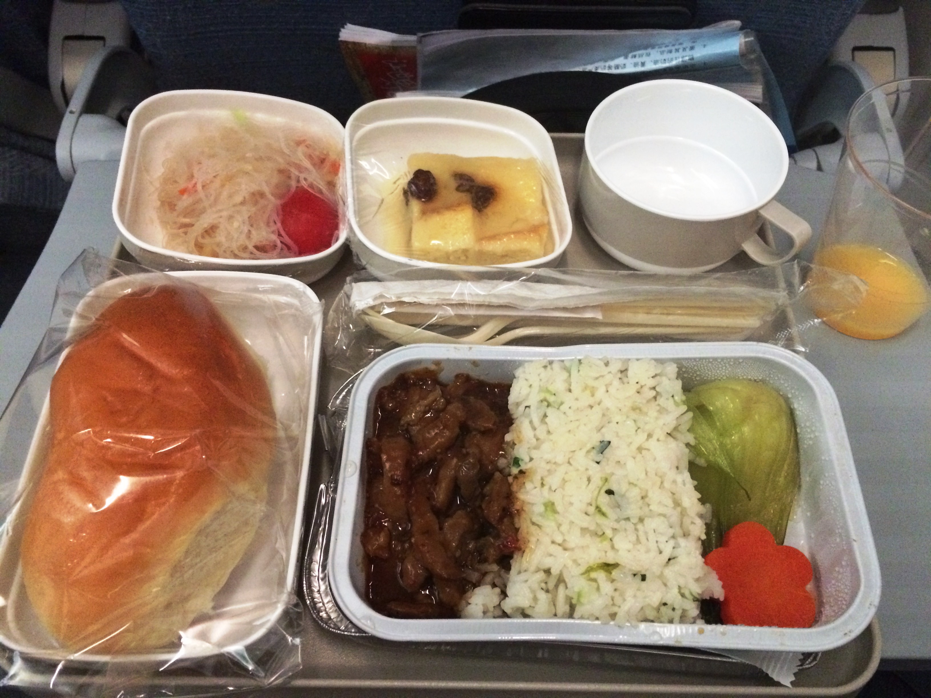 Smaczny posiłek – wieprzowina z ryżem i chińską kapustą. Do tego sałatka w postaci zimnego twardego makaronu ryżowego (takie niespotykane połączenie zimnego makaronu z warzywami), bułka z masłem i ciastko bliżej nieokreślonego smaku (niedobre). Mięso miękkie, w aromatycznym kwaskowatym sosie, ryż lekko sklejony.
