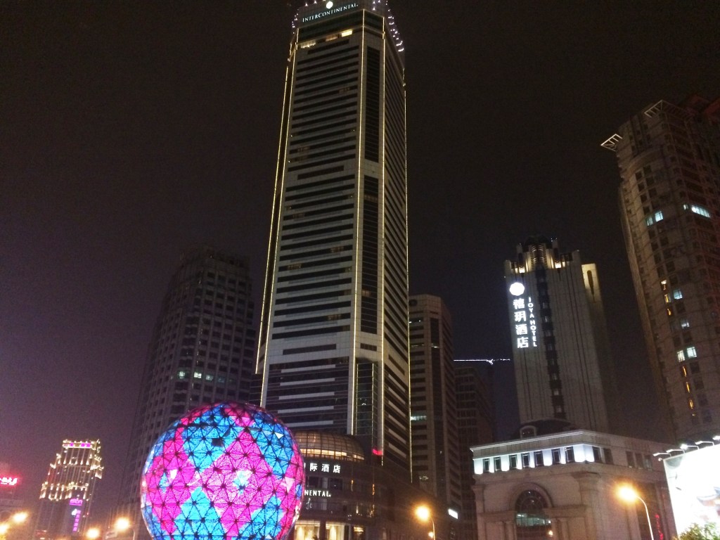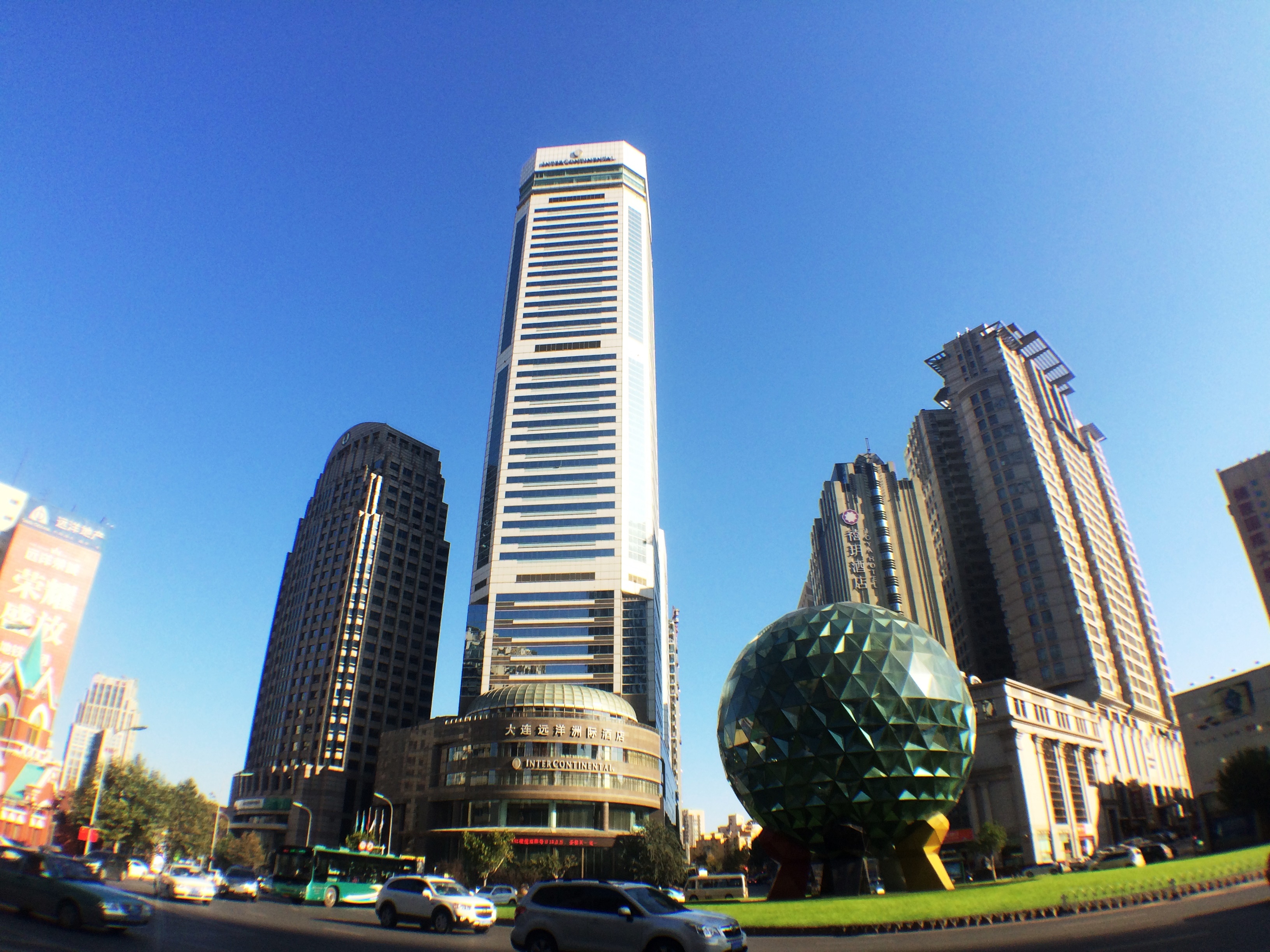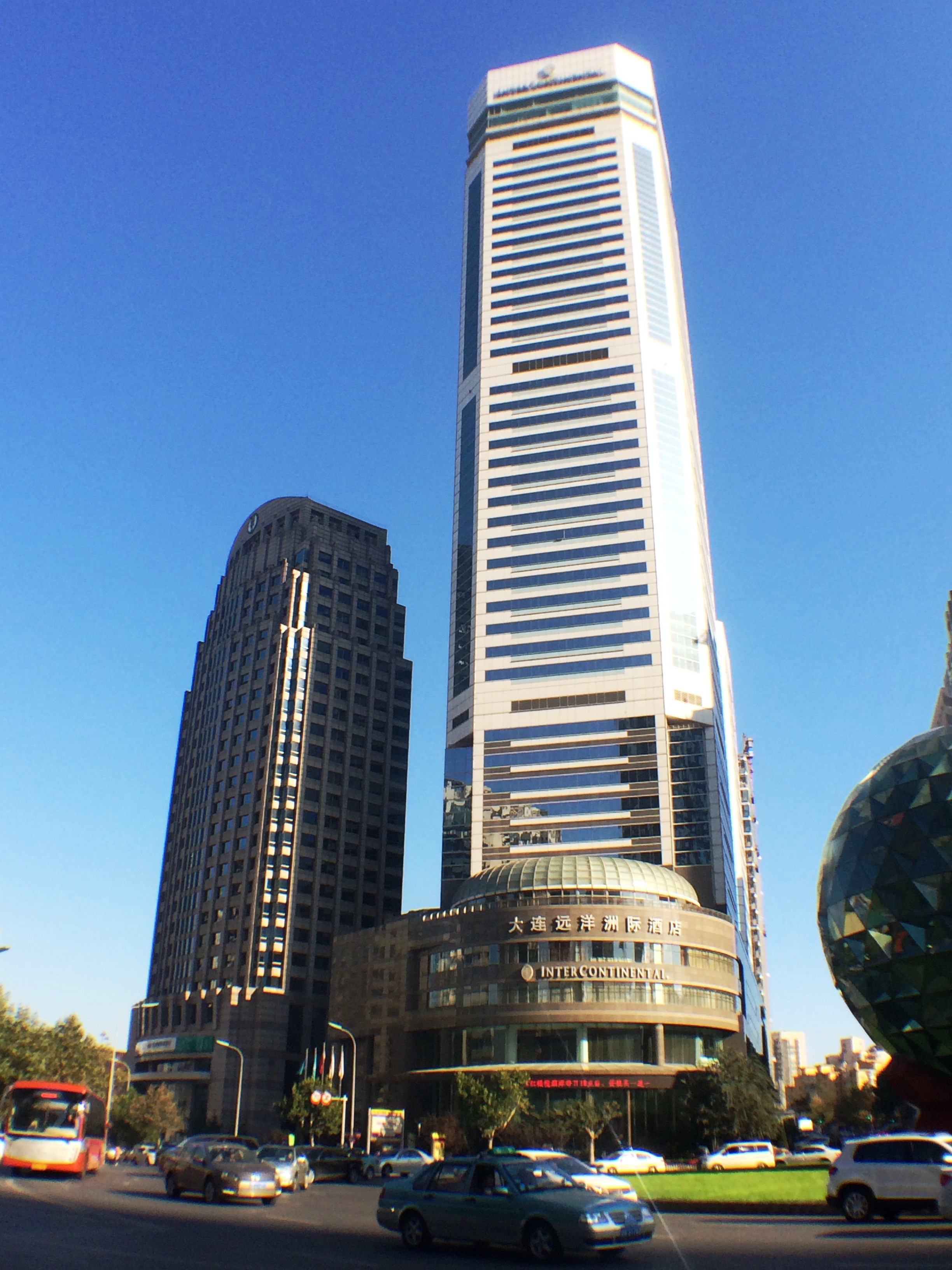 Podczas wizyty w Dalian hotelowy wybór padł na Intercontinentala z grupy IHG. Z zewnątrz prezentuje się całkiem nieźle, ciekawa bryła widoczna jest z daleka. Jako jeden z nielicznych hoteli w Dalian ten był ładnie oświetlony w nocy – nie wiem czemu, ale w Dalian maja bardzo dużo „skyscrappersów”, a większość na noc zostawia co najwyżej włączoną lampkę ostrzegawczą dla samolotów – może regulacje rządowe i/albo oszczędzanie energii?