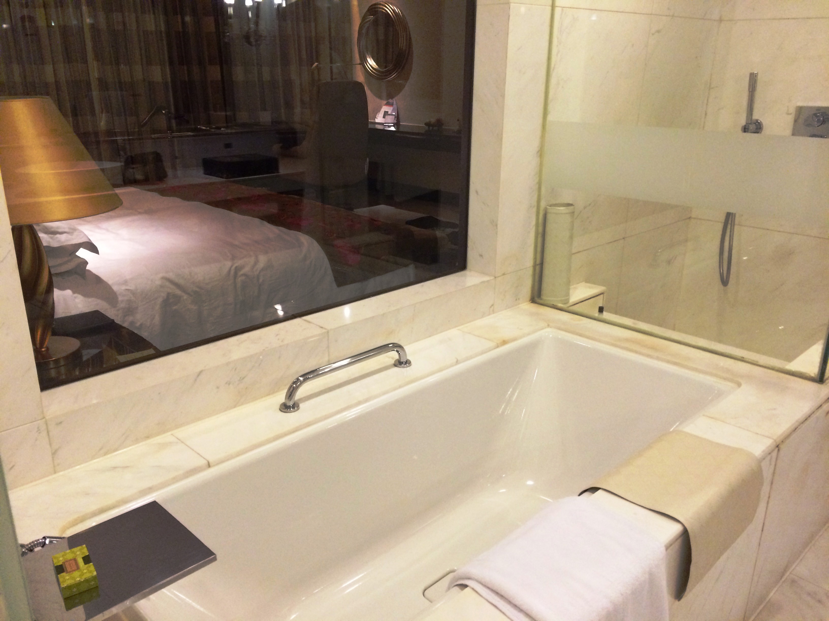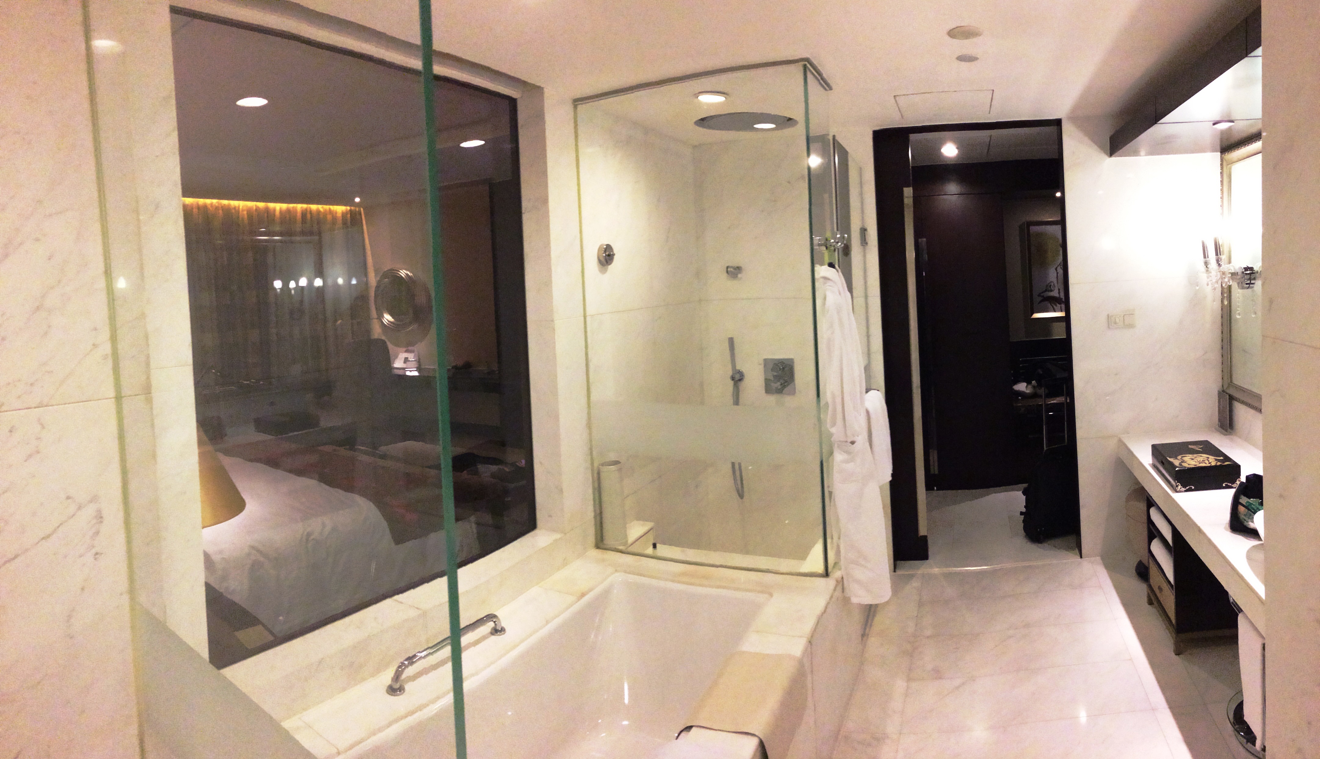 POKÓJ: Duży z wielkim oknem z którego widok prezentuje zdjęcie powyżej. W łazience kolejne duże okno z roletą sterowaną elektrycznie. Podnosimy ją sobie i już widzimy TV, a nad wanną mamy głośnik żeby dobrze słyszeć. Pokój nosił jednak duże znaki używania. Sporo plam i uszkodzeń, podrapanych mebli, nie do końca starte kurze z szafek – szczególnie z wyższych miejsc. Chińczyki nie należą do wysokich, ale drabinkę mogą sobie ogarnąć.