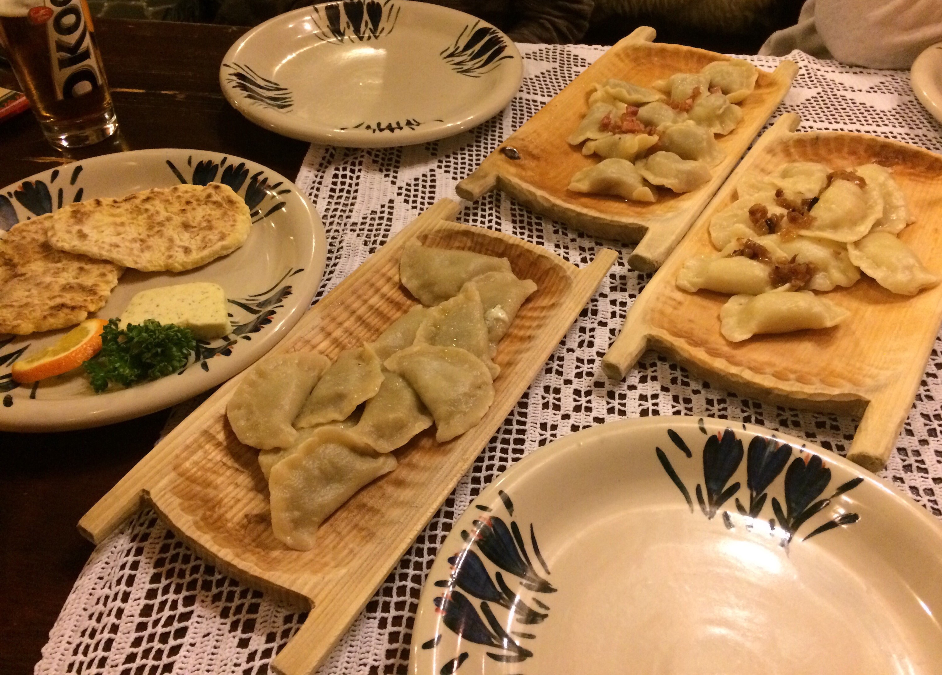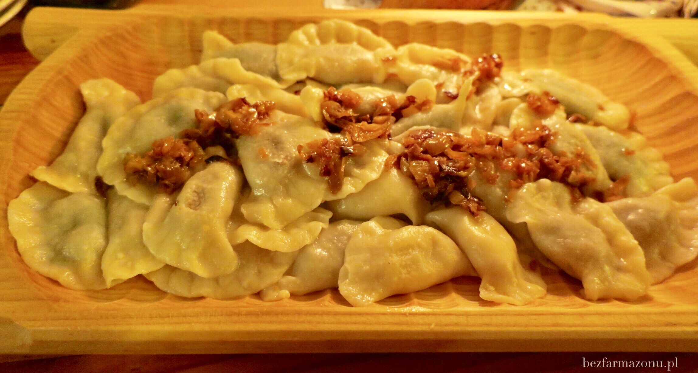 1. Pierogi ruskie, z mięsem oraz kapustą i grzybami – smaczne, ale nie rewelacyjne. Podane na drewnianych tacach, okraszone skwarkami, posklejane za sobą co powodowało problemy z nałożeniem sobie paru sztuk. Ciasto smaczne, farsz poprawny i dobrze przyprawiony, ale jadłem lepsze.
