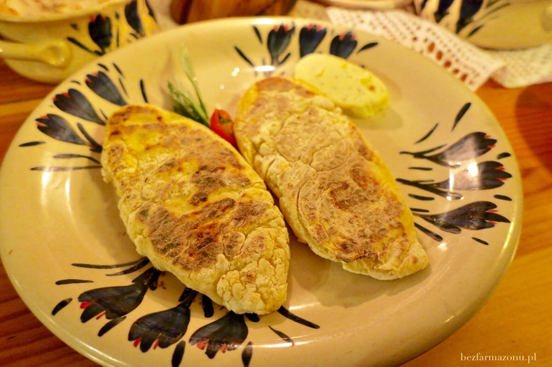 2. Moskole z masełkiem ziołowym. Jadłem je pierwszy raz. Smaczne, delikatne – smażone bez oleju. Po posmarowaniu intensywnym masłem szybko zniknęły z talerza.