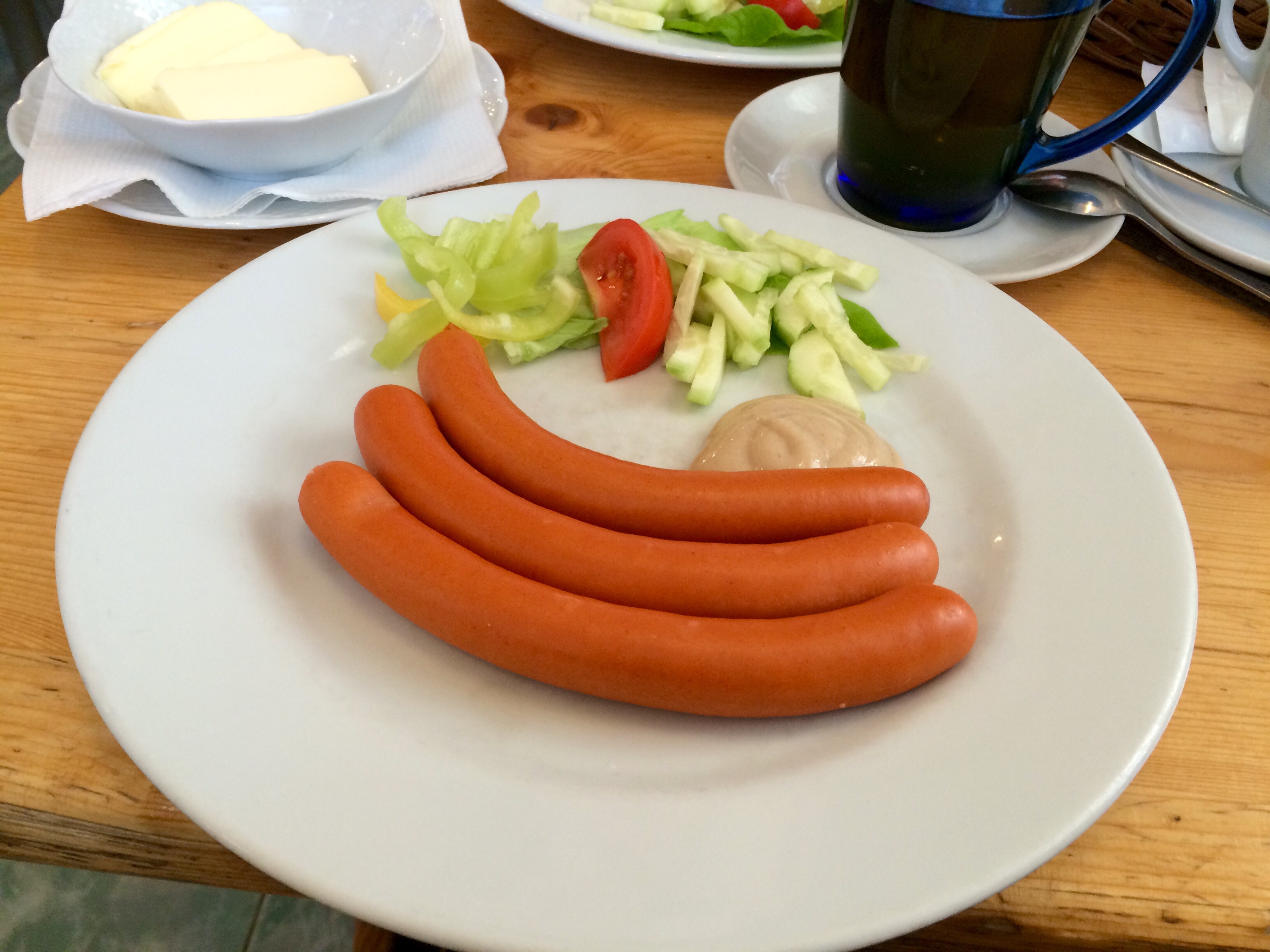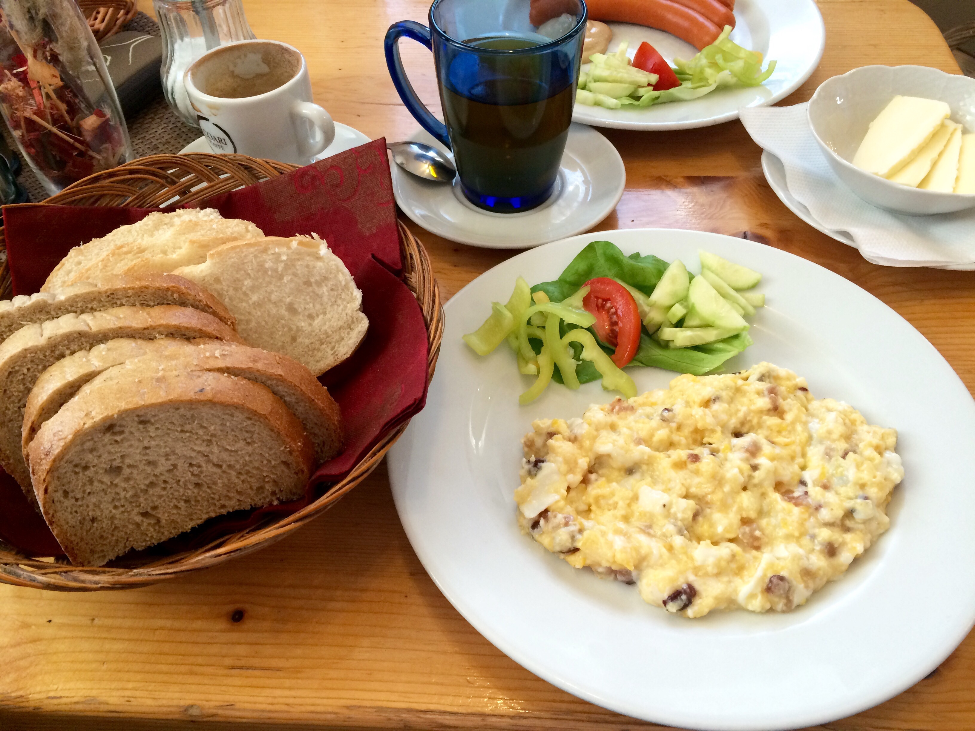 Zamówiliśmy jajecznicę z boczkiem i trzy parówki z musztardą, dodatkowo masło śmietankowe, białą kawę i herbatę z cytryną. Wszystko kosztowało niecałe 8 euro. Jajecznica lekko ścięta z chrupiącymi kawałkami boczku. Parówki z pikantną nutką. Dwa rodzaje pieczywa dobrze wchodziły z masłem śmietankowym i smaczną papryką oraz zielonym ogórkiem. Kawa podana z chrupiącym wafelkiem.