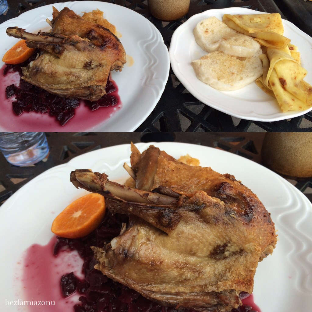 - ćwiartka kaczki z dwoma surówkami, knedliczkami i naleśnikami – bardzo duża porcja. Nie jestem fanem jedzenia drobiowych skórek, ale ta była tak przypieczona, że musiałem spróbować – no i nie zawiodłem się – była wyśmienicie chrupka. Mięso miękkie i smaczne. Obie surówki były na ciepło – pierwsza z czerwonej kapusty, druga przypominająca nasz bigos. Knedliki w sumie takie same jak u czeskich sąsiadów. Zaskoczeniem były naleśniki – ciasto takie samo jak nasze polskie używane do tych z serem czy dżemem, ale wyraźnie usmażone były na smalcu – dawało im to ciekawy aromat. Bardzo poprawne danie – nie zawiodłem się.