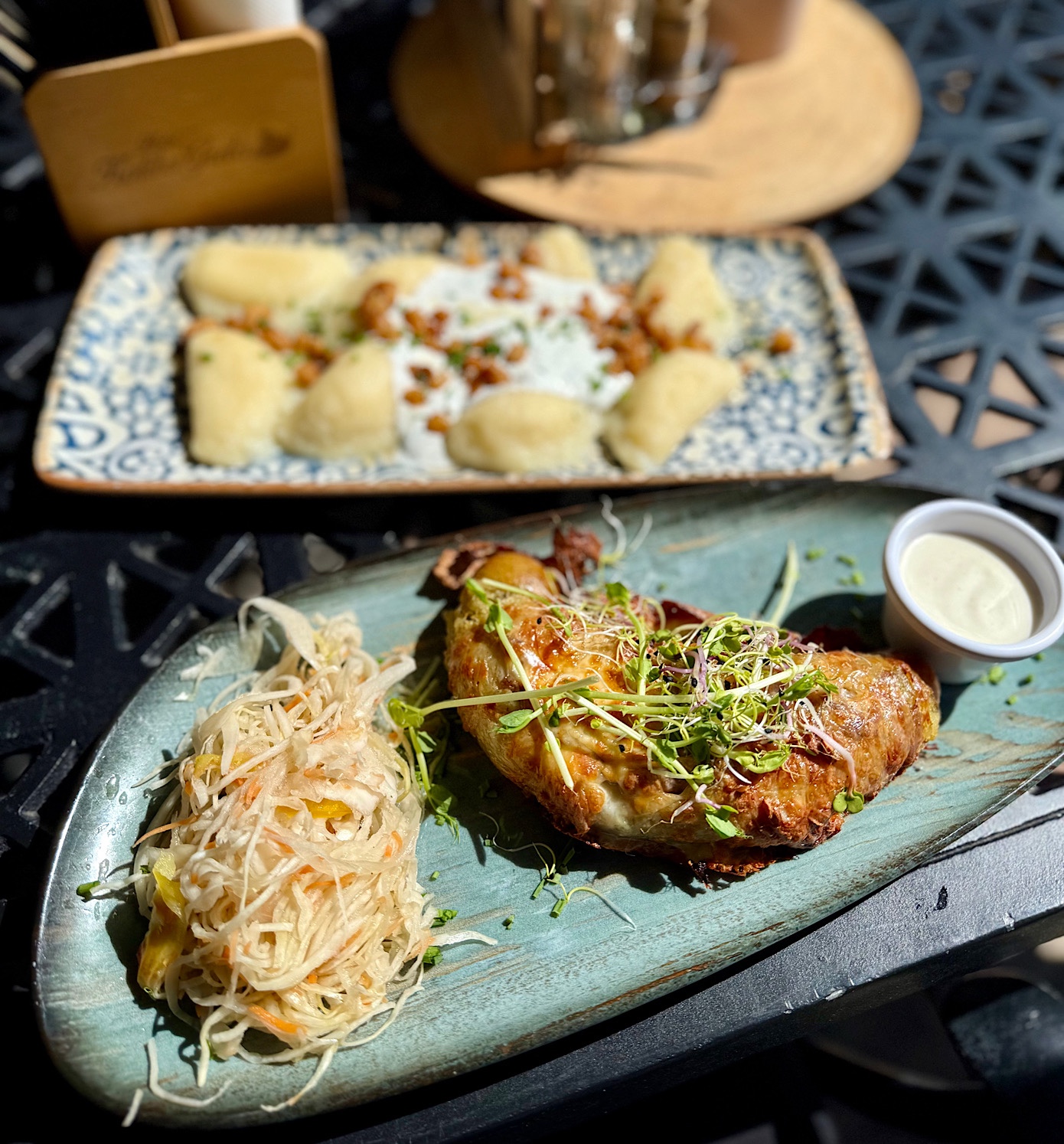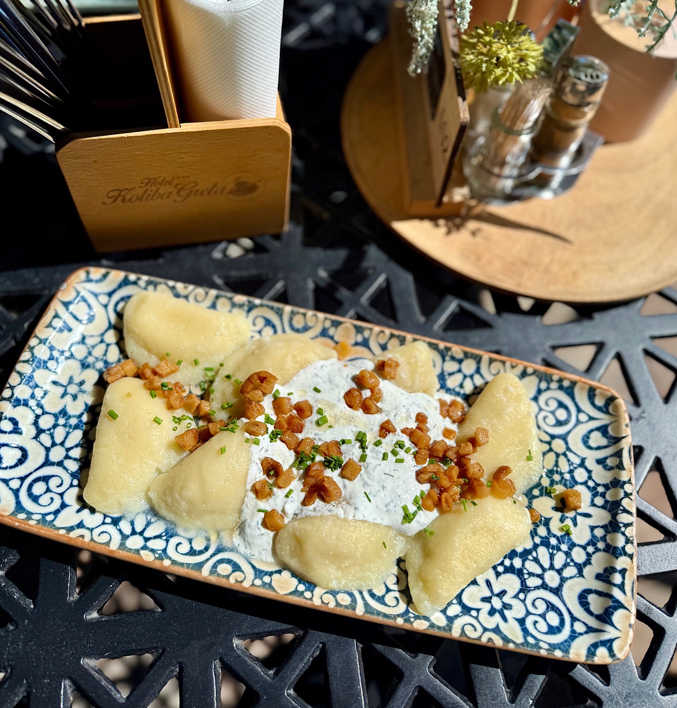 - pierogi z bryndzą i słoniną – osiem polanych śmietaną z koperkiem sztuk podano wraz z kubkiem zsiadłego mleka w cenie dania. Pierogi z treściwym wypełnieniem i bardzo dobrą słoniną. Smaczne.
