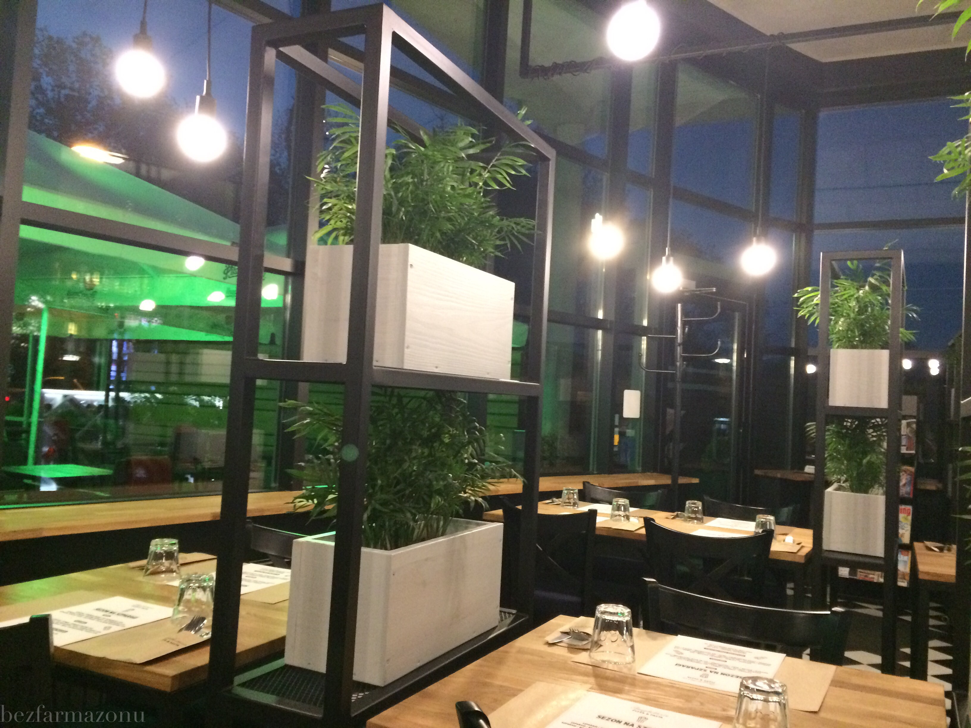 Tuż po przyjściu byliśmy jedynymi gośćmi, ale z czasem liczba zajmowanych stolików się zwiększała. Nowoczesny wystrój, okna od podłogi do sufitu i zieleń dzieląca stoliki – świeżo, jasno i sterylnie.