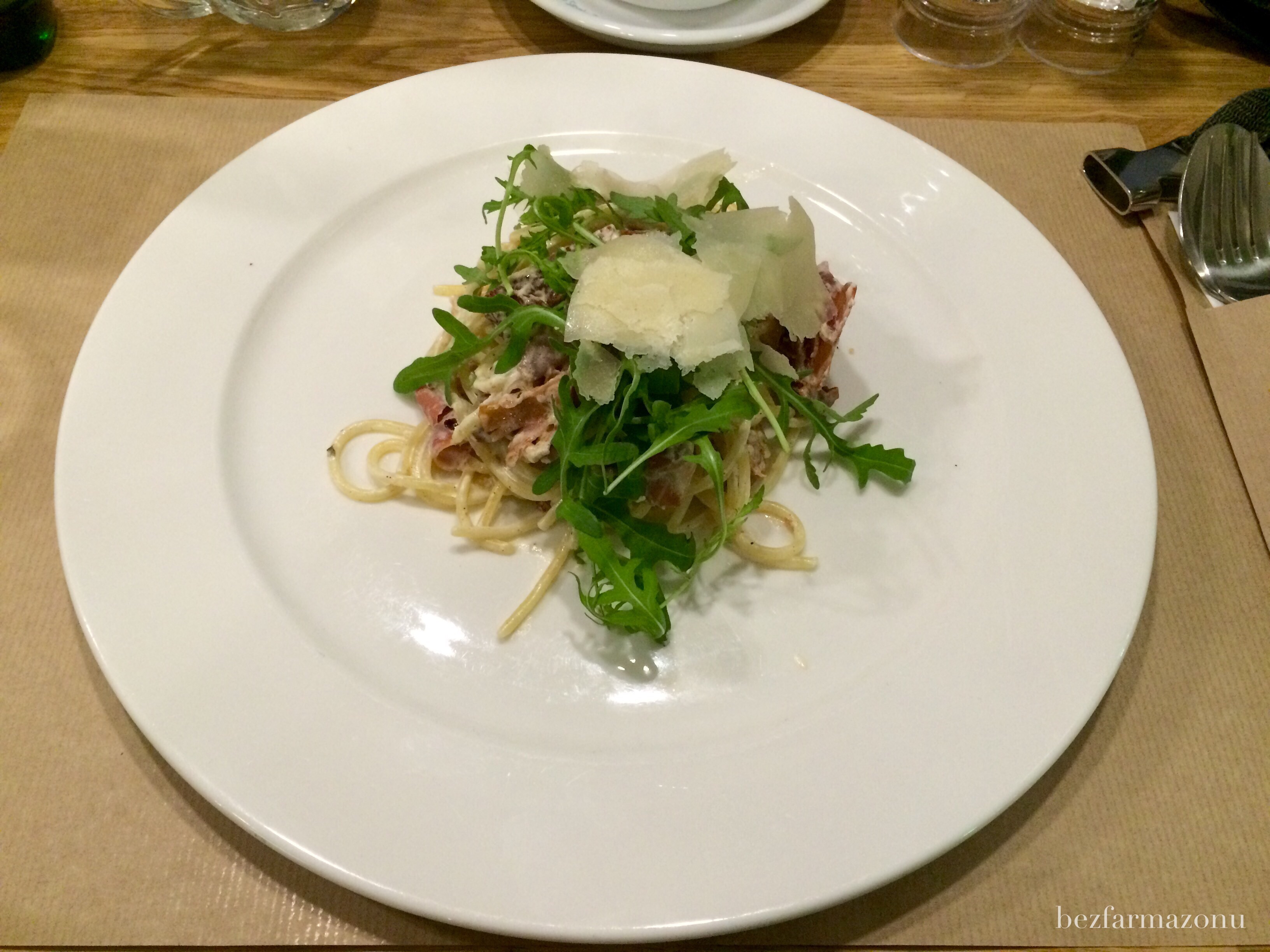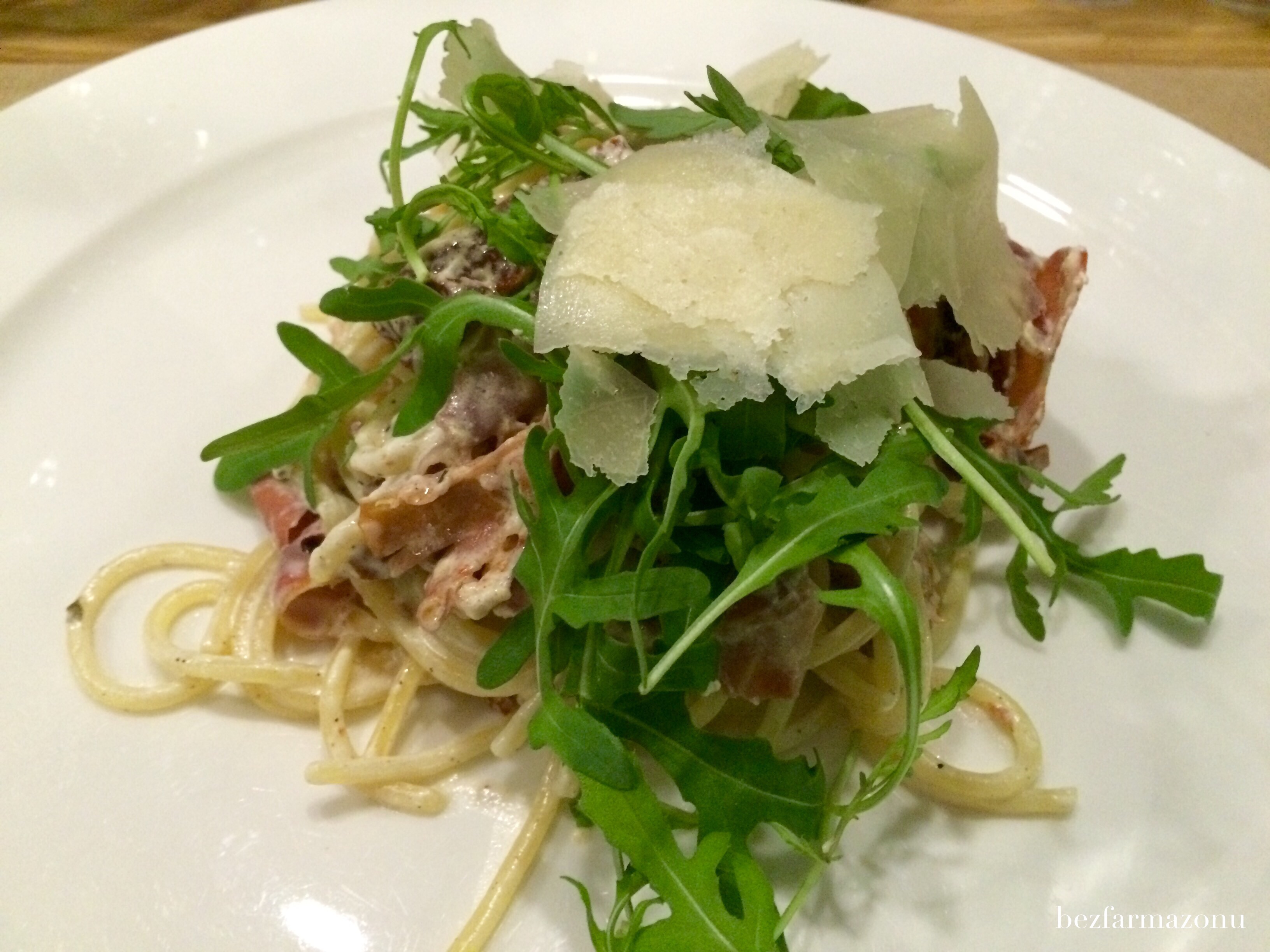 Zaczęliśmy od Spaghetti Parma Rucola 26 PLN. Pani kelnerka bez problemów i komentarzy zgodziła się na podzielenie jednej porcji na dwa talerze. Warto nadmienić, iż jest pare rodzajów makaronu z którym możemy skomponować nasze danie – dla dbających o jakość węglowodanów jest też pełnoziarnisty.