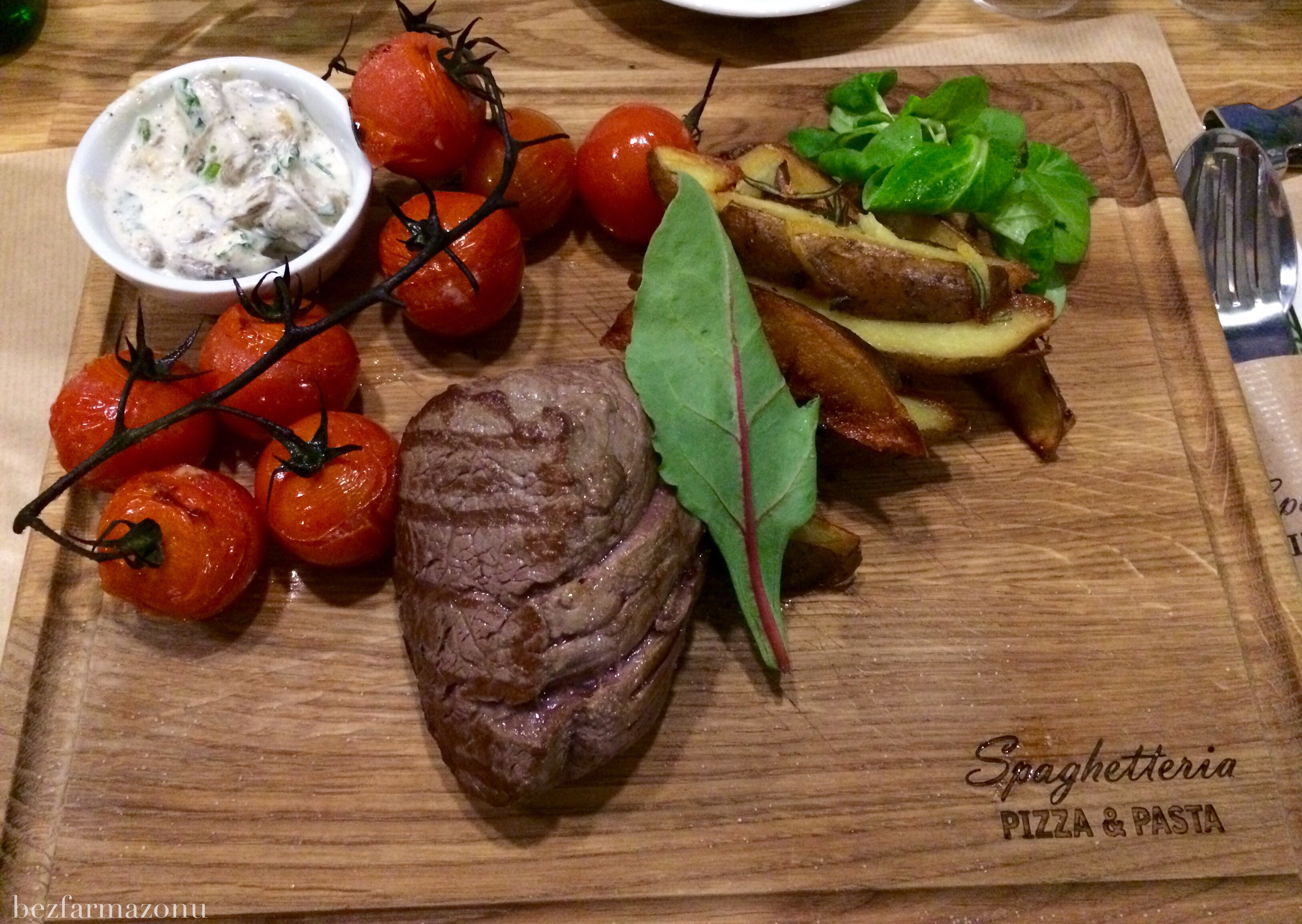 - polędwica wołowa z grillowanymi pomidorkami cherry, opiekanymi ziemniakami oraz sosem borowikowym 45PLN. Mniej więcej 180g stek był krwisty tak jak chciałem, idealnie sprężysty i łatwo się kroił nawet zwykłym nożem, chociaż uważam, że do steka powinny być podane takie z grubszą piłką. Bardzo dobre, lekko słodkie pomidorki grillowane łącznie z gałązką – skórka łatwo odchodziła. Ziemniaki z dodatkiem rozmarynu też smaczne. Najsłabszym ogniwem był sos borowikowy na bazie śmietany, podany w oddzielnym pojemniczku – grzyby nie do końca wypłukane, dało się wyczuć piasek co któryś kęs. Wszystko podane jak w większości miejsc serwujących steki – na sporej, grubej, drewnianej desce. Podoba mi się taki układ, bo jest sporo miejsca do operowania sztućcami.