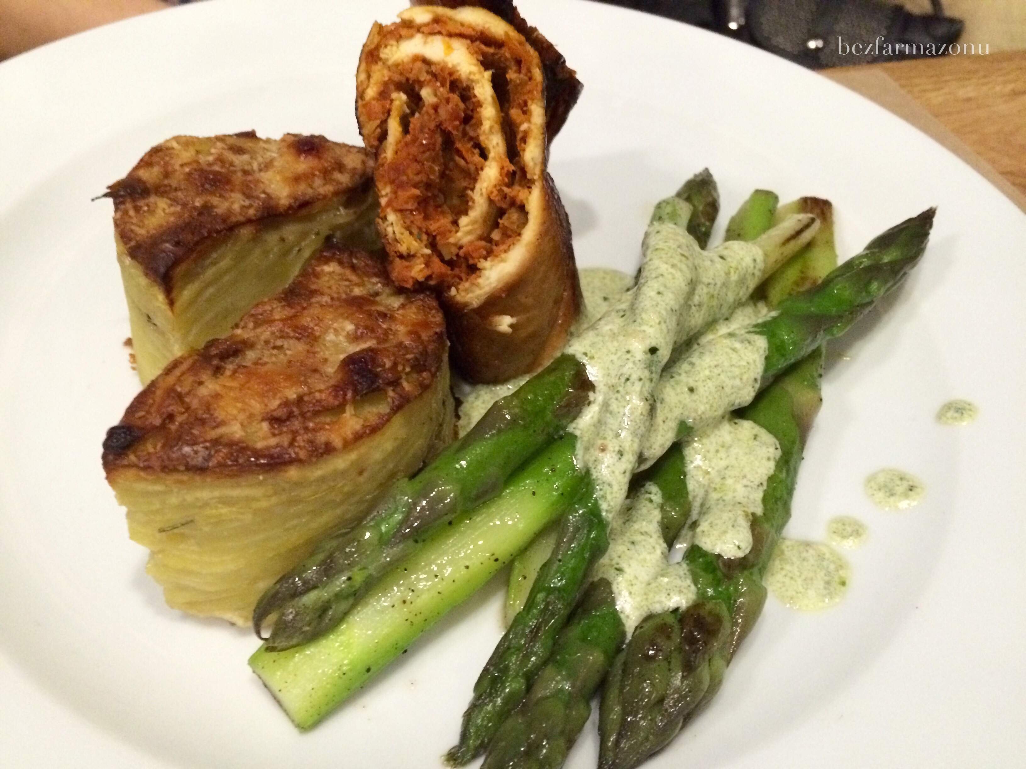 - pierś kurczaka faszerowana pomidorami i migdałami z ziemniakami gratin i grilowanymi szparagami 26PLN. Ziemniaki gratin – forma, smak, konsystencja, poziom przypieczenia – wyjątkowe. Szparagi przed grillowaniem obrane tak jak trzeba, nie trafiła się ani jedna twarda sztuka. Dwa kawałki mięsa jak dla mnie miały za dużo suszonych pomidorów i to właśnie one zdecydowanie górowały smakiem, jak ktoś lubi te warzywka będzie zadowolony.