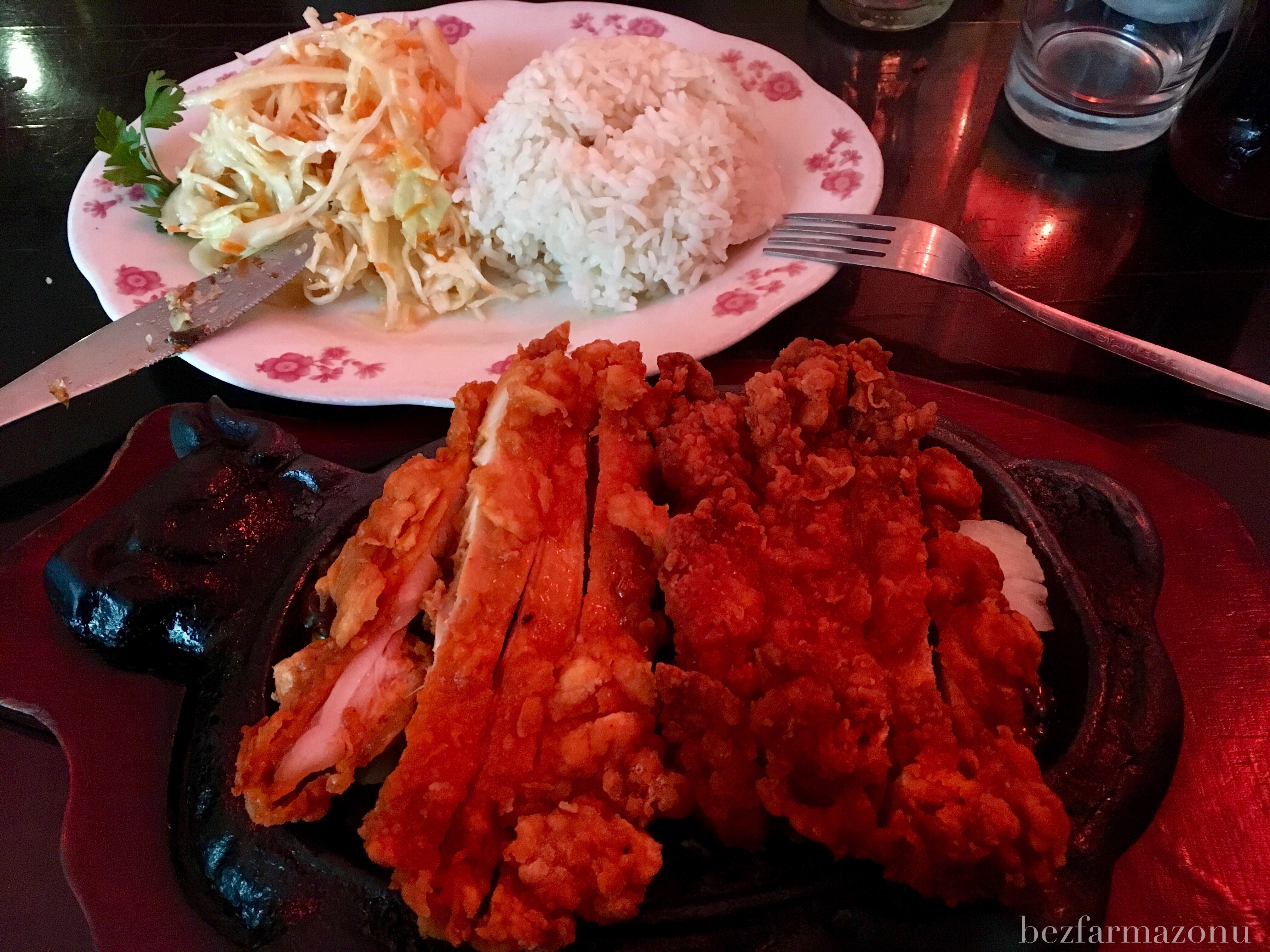 - Pierś kurczaka w panierce 15 PLN – kilka 60-90 gramowych kawałków mięsa w bardzo chrupiącej i tłustej panierce. Potrawa jest smaczna, ale jak każdy panierowany kotlet bardzo kaloryczna. Chrupkość i smak 9/10.