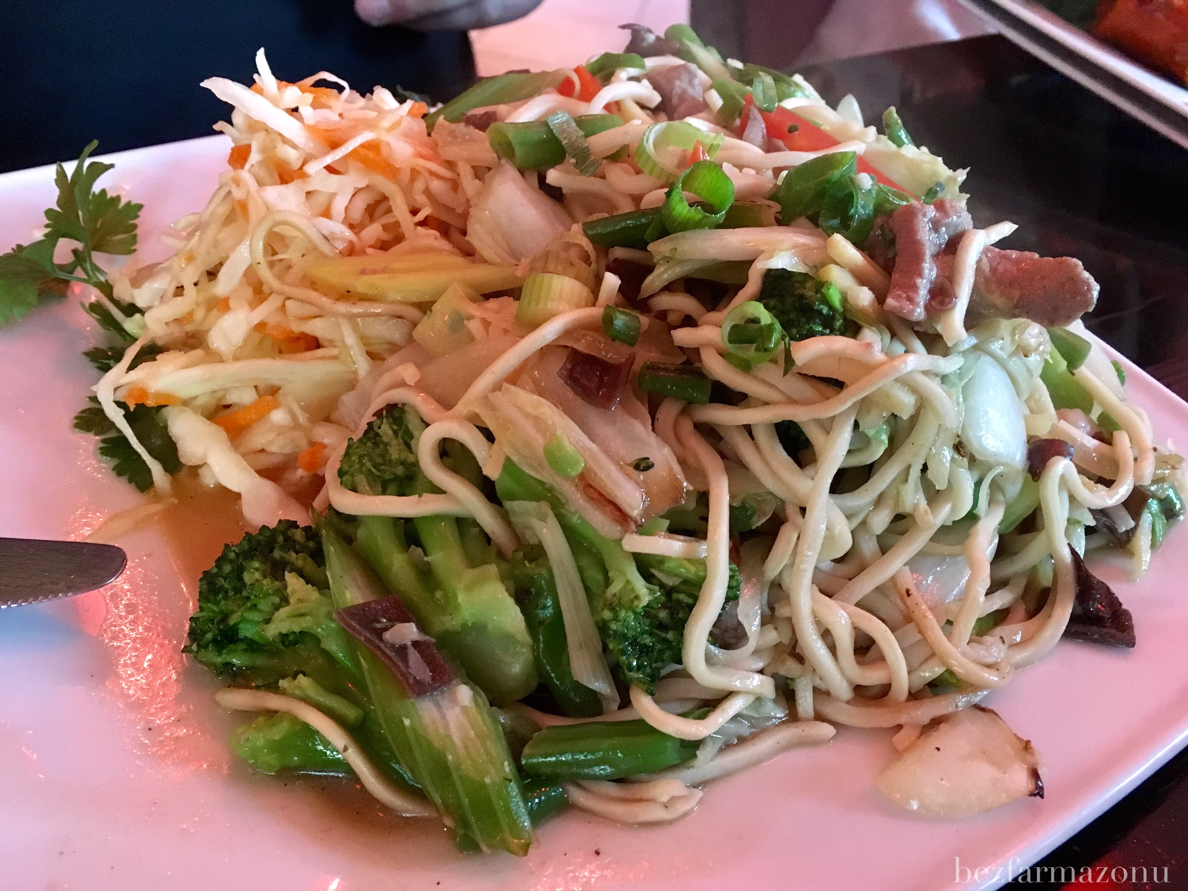 - Makaron sojowy z wołowiną i warzywami 16 PLN – porcja ogromnych rozmiarów, mięso miękkie i nieżylaste; makaron bardzo ładnie pachnący, super aromatyczny sos sojowy wraz z miękkimi warzywami bardzo dobrze smakuje;