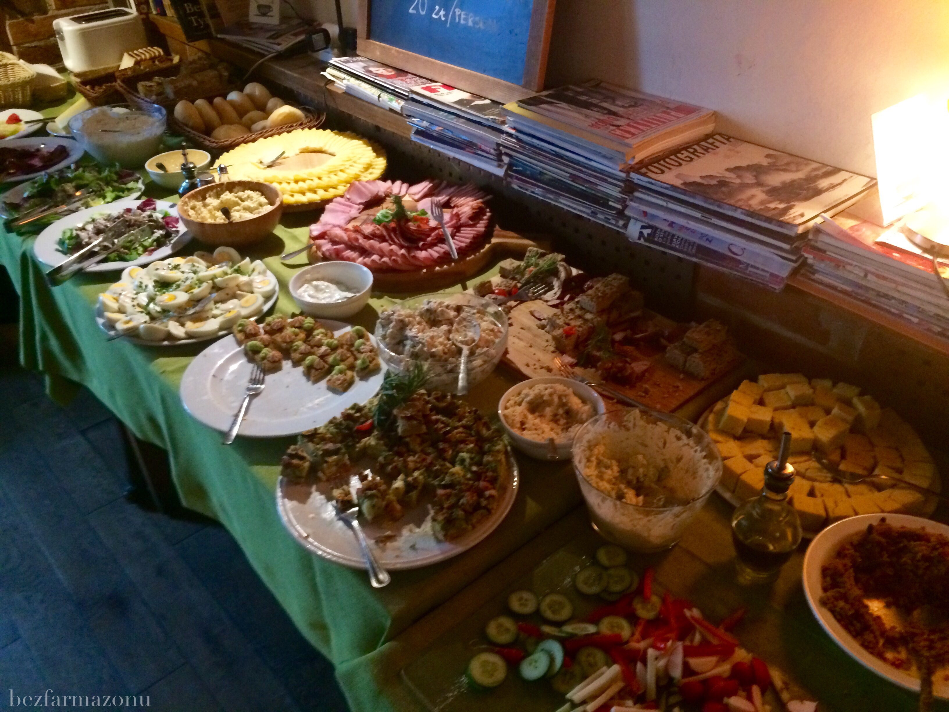 Co znajduje się na szwedzkim stole? Wędliny, wiejska kiełbasa, sery, twarożki, pasty, warzywa, kiełbaski na ciepło, jajecznica, jajka na twardo, kilka rodzajów pieczywa. Jak ktoś lubi na słodko to są drzemy, miody, „cheeriosy”, nutella, masło orzechowe, sałatka owocowa, ciastka. W cenie jest też kawa, herbata i woda.