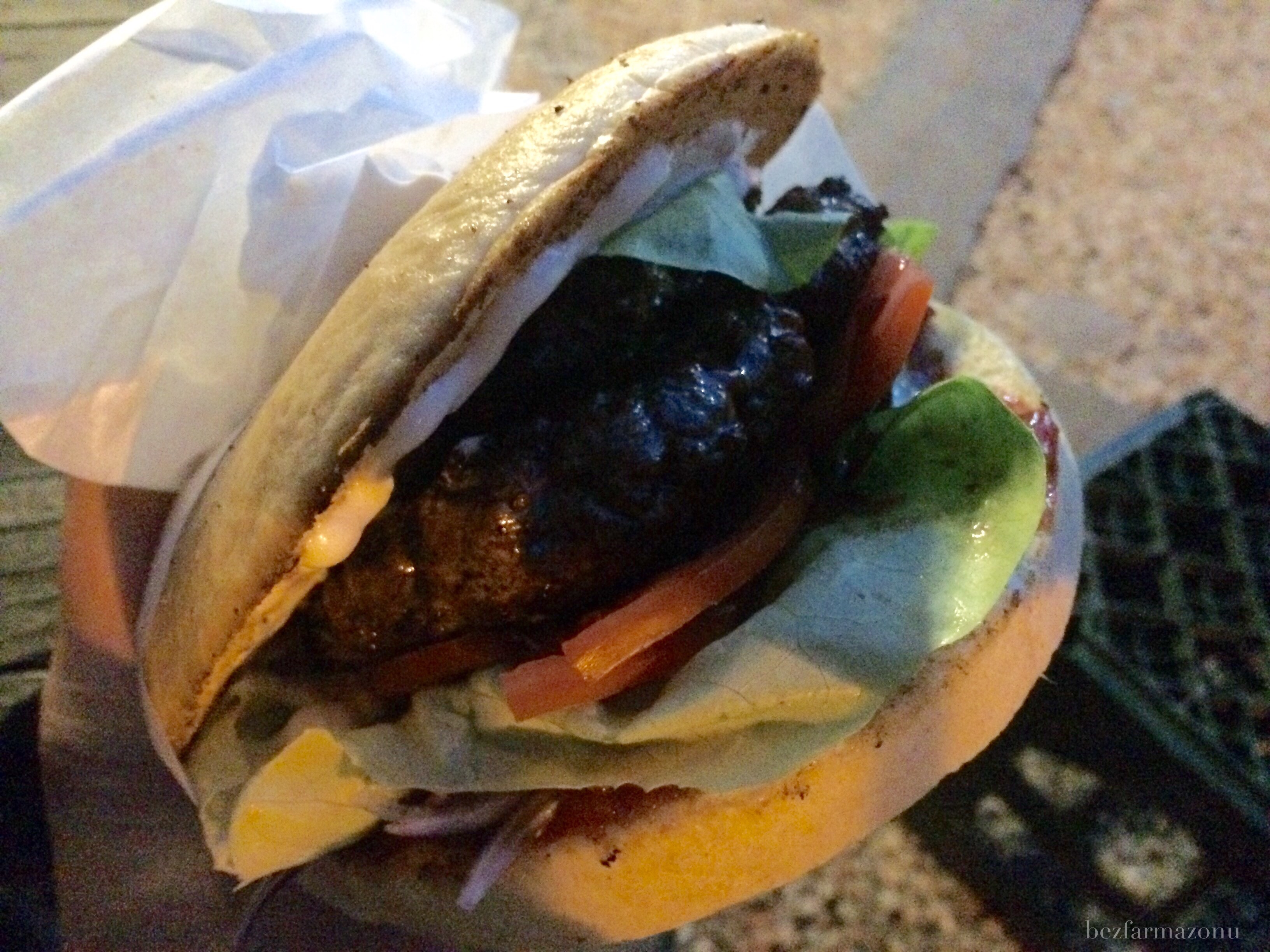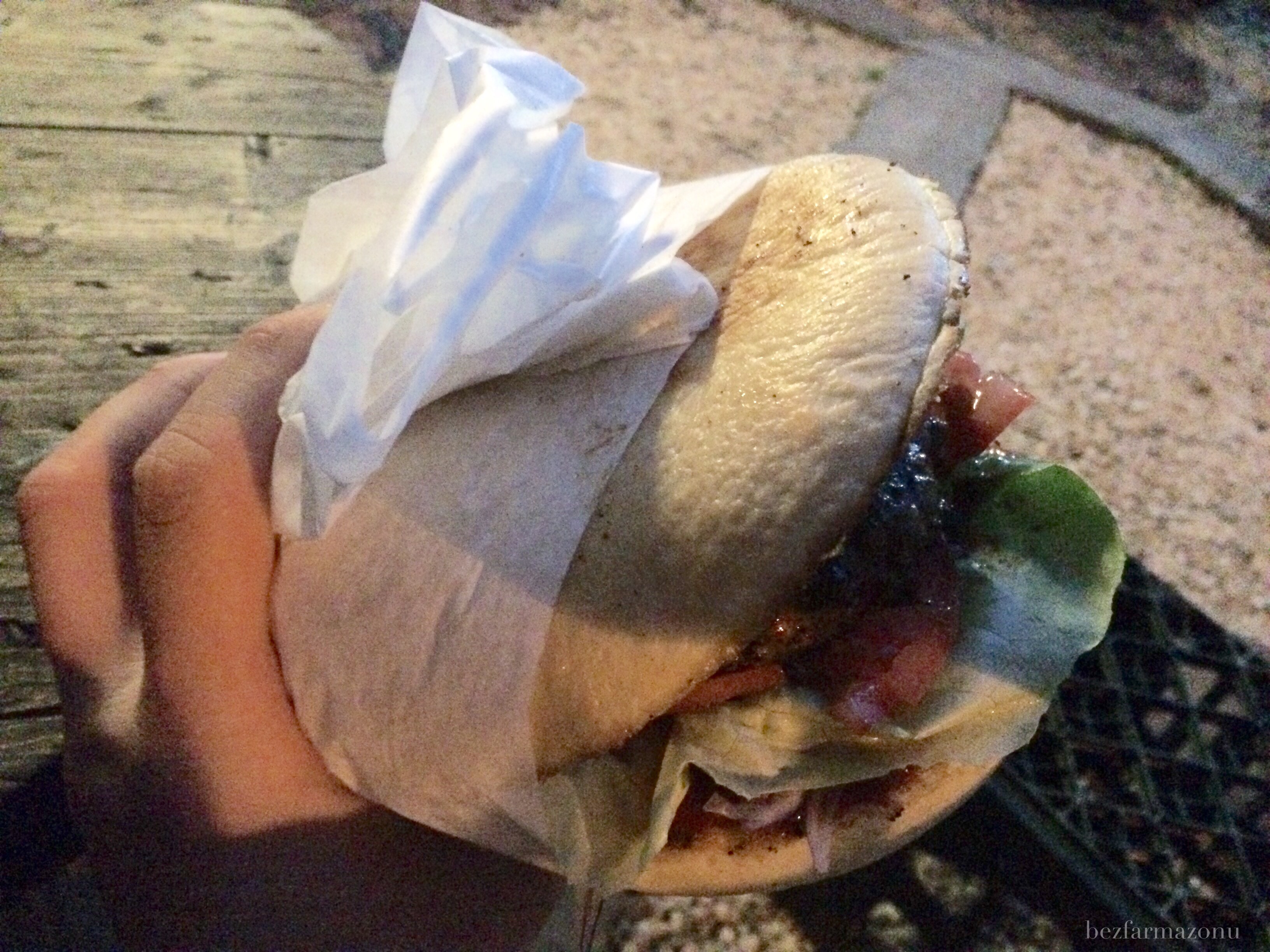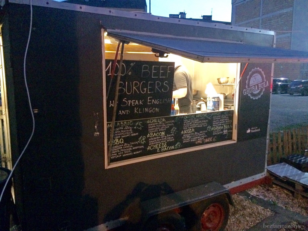 Gruba Buła serwuje tylko burgery – wszystkie UWAGA z 220g mięsa co stawia ich na samej górze podium jeśli chodzi o gramaturę. Cena takiego przykładowego Classica to 15 PLN! Konsumujemy „po hipstersku” czyli siedzimy na kratach z piwa/napojów przy prowizorycznym stoliku – w lecie nic więcej na szybki fast food nie jest potrzebne.