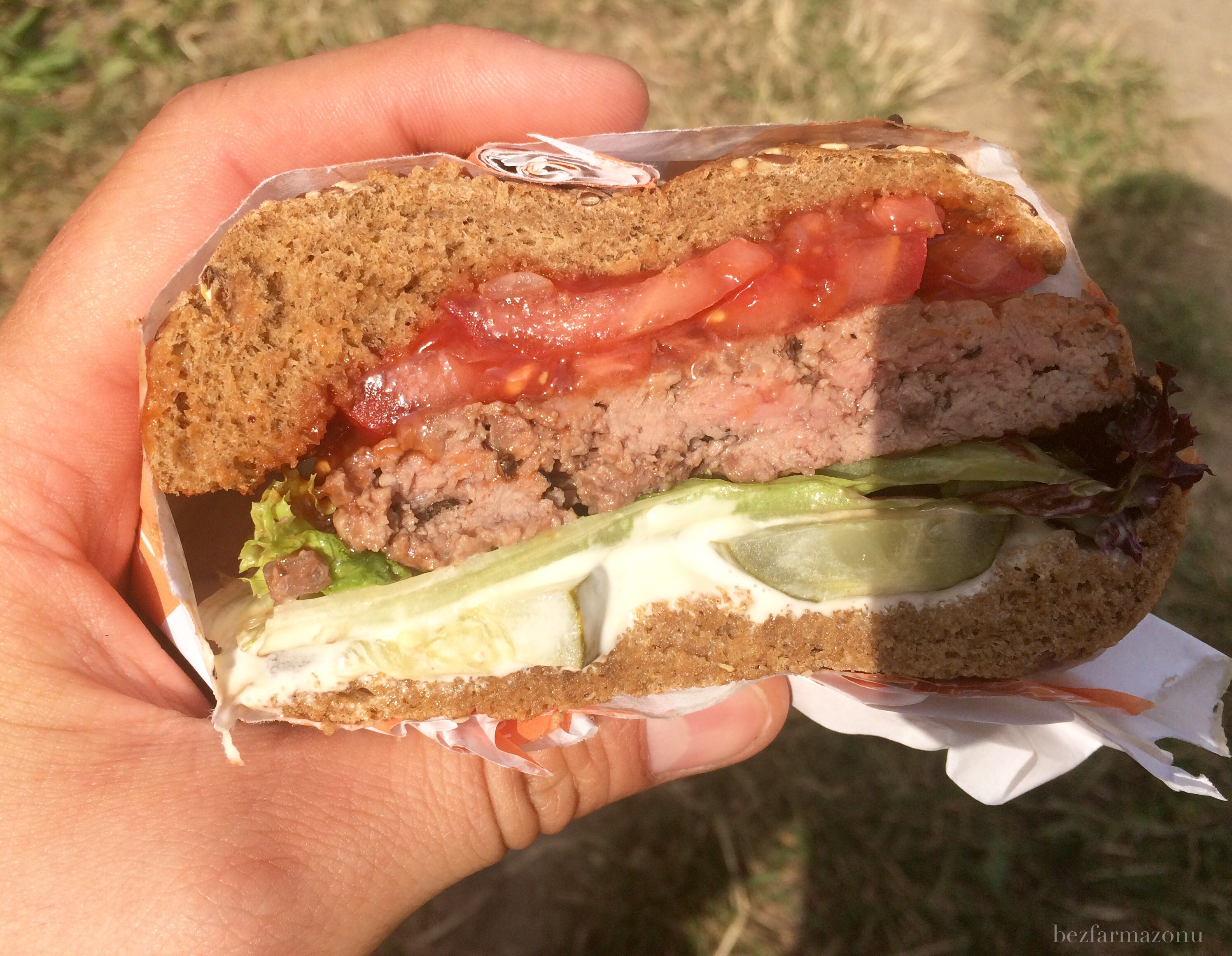 Na zdjęciu poniżej połówka Classica, który wg życzenia został dobrze wysmażony. Nie ma tam mowy o oszczędzaniu pomidorów czy ogórków, sos majonezowy podnosi kaloryczność ale co tu dużo pisać, burger bez niego traci na smaku. Bułka dobrze chrupiąca.
