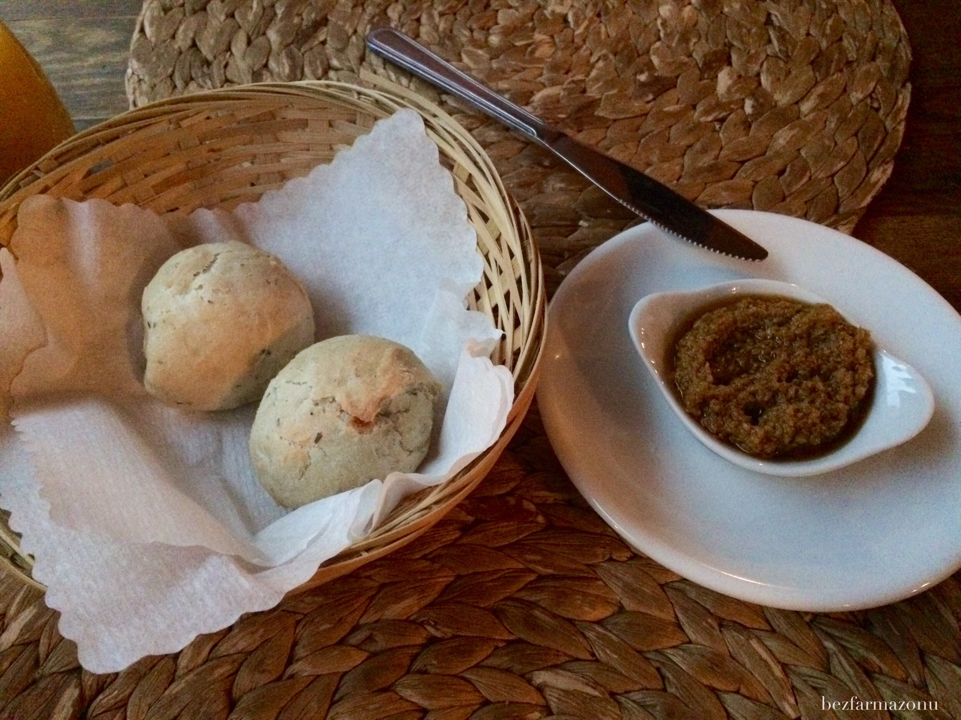 Chwilę po tym jak usiedliśmy zainteresowała się nami Pani z obsługi, a my zamówiliśmy przystawki i napoje na start. Zanim o przystawkach to jedno zdanie o czekadełku, które umila i ucisza burczące żołądki. Dostaliśmy dwie pszenne świeżo wypieczone bułeczki wraz z pastą oliwkową. Fajnie – lubię takie małe gratisiki.