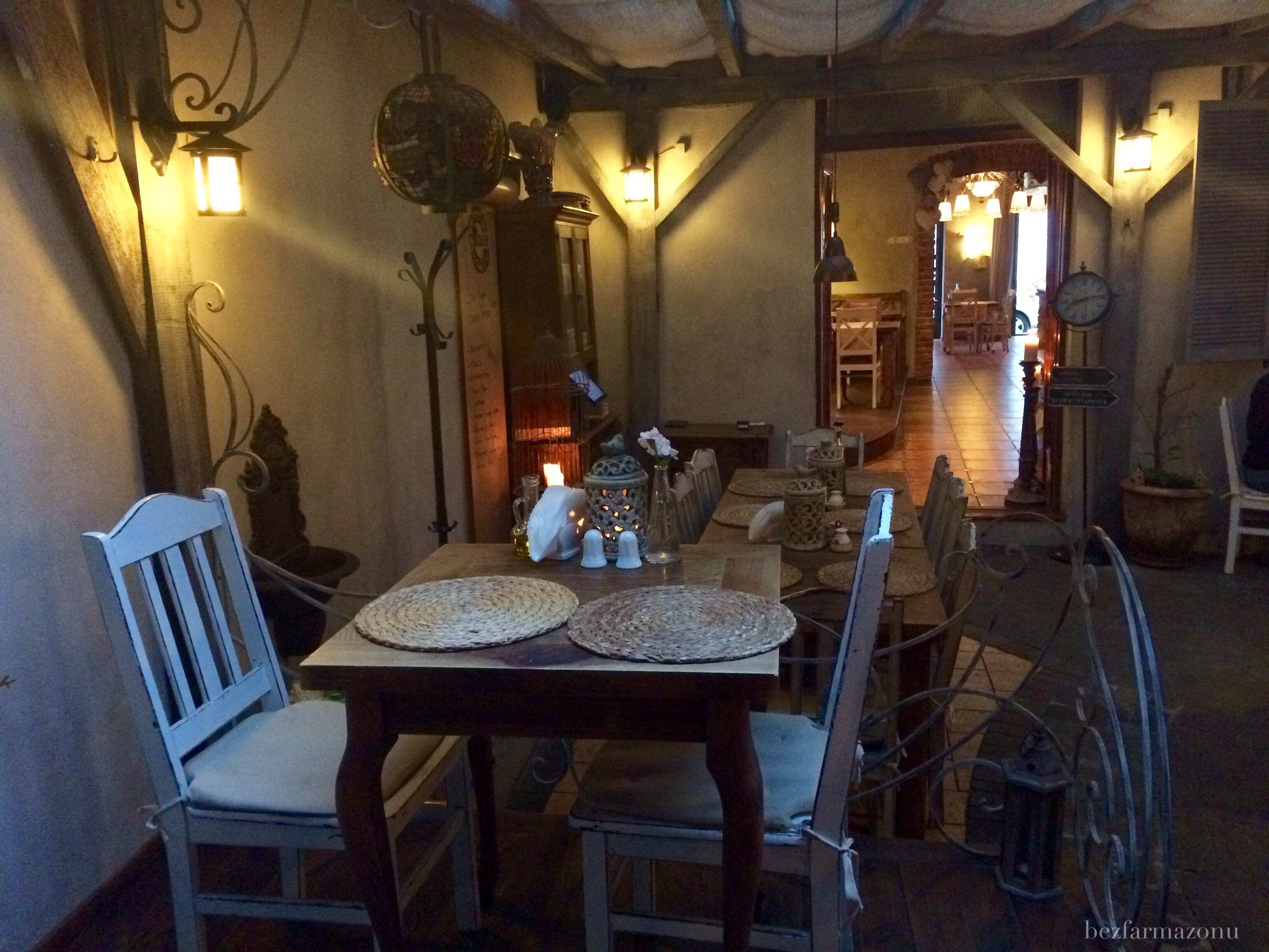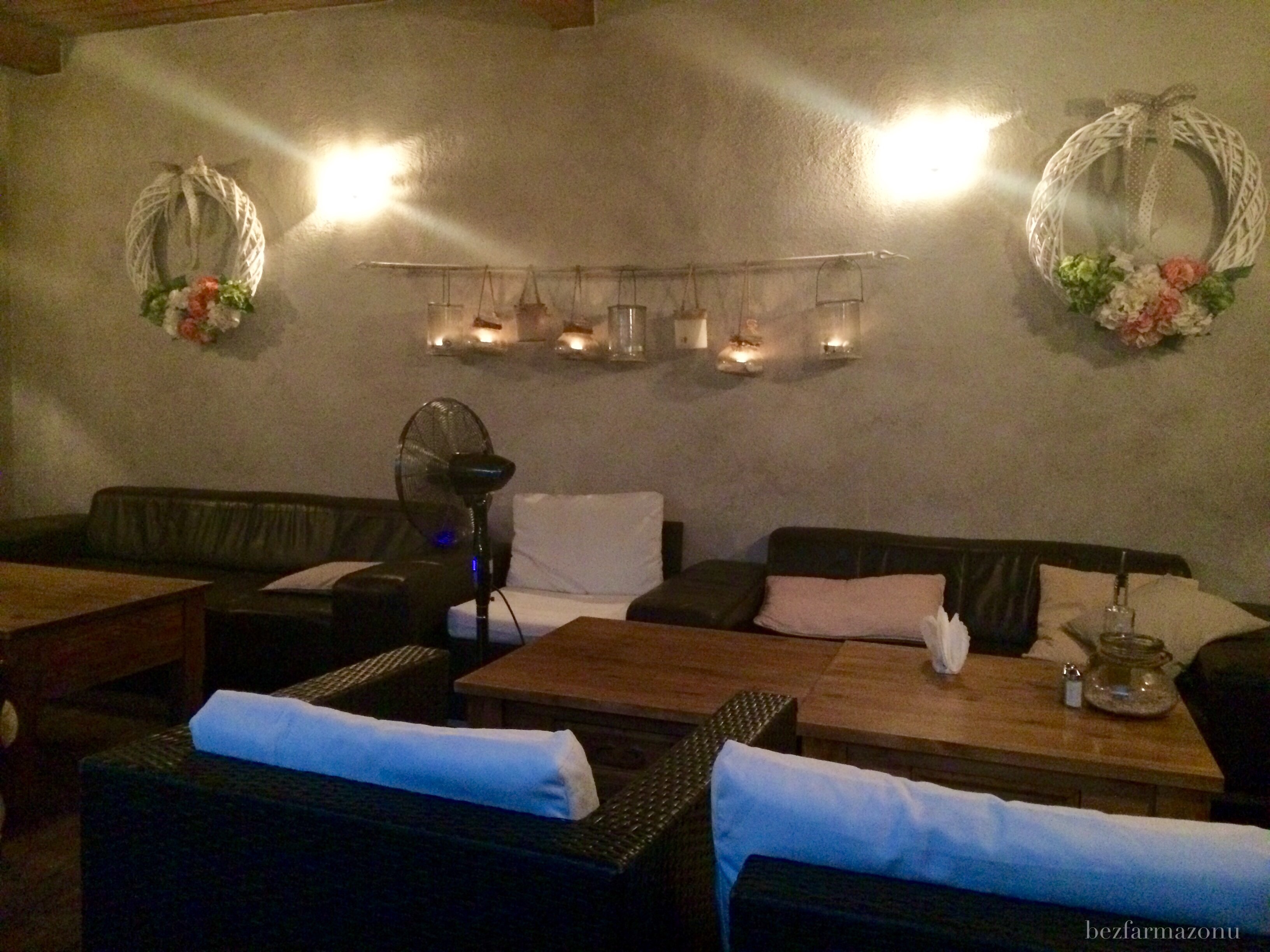 Restauracja jest fajnie urządzona. Można zająć miejsce w jednej z dwóch mniejszych sal albo w ogródku. W tym ostatnim jest bardzo przyjemnie, są zwykłe stoliki z krzesłami, są też duże kanapy z poduchami.