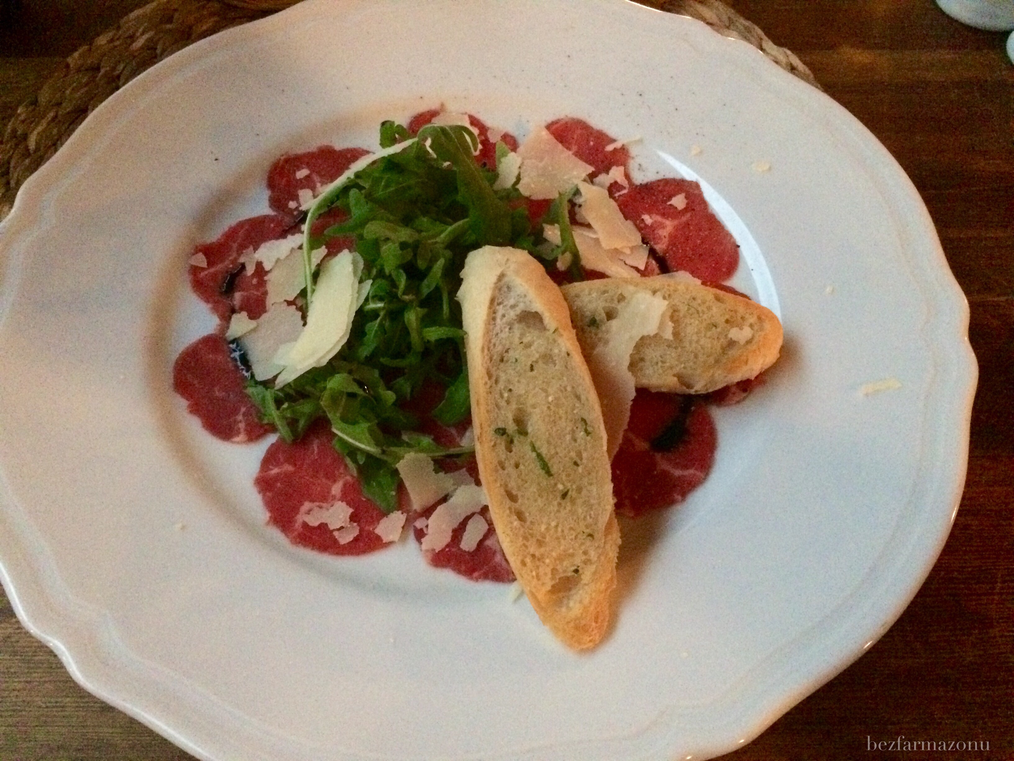 - carpaccio wołowe z rukolą, parmezanem, sosem balsamicznym i chrupiącymi grzankami 25 PLN – w sumie standardowo podane, mięso aromatyczne i delikatnie bez żył – jest szansa, że była to rzeczywiście polędwica