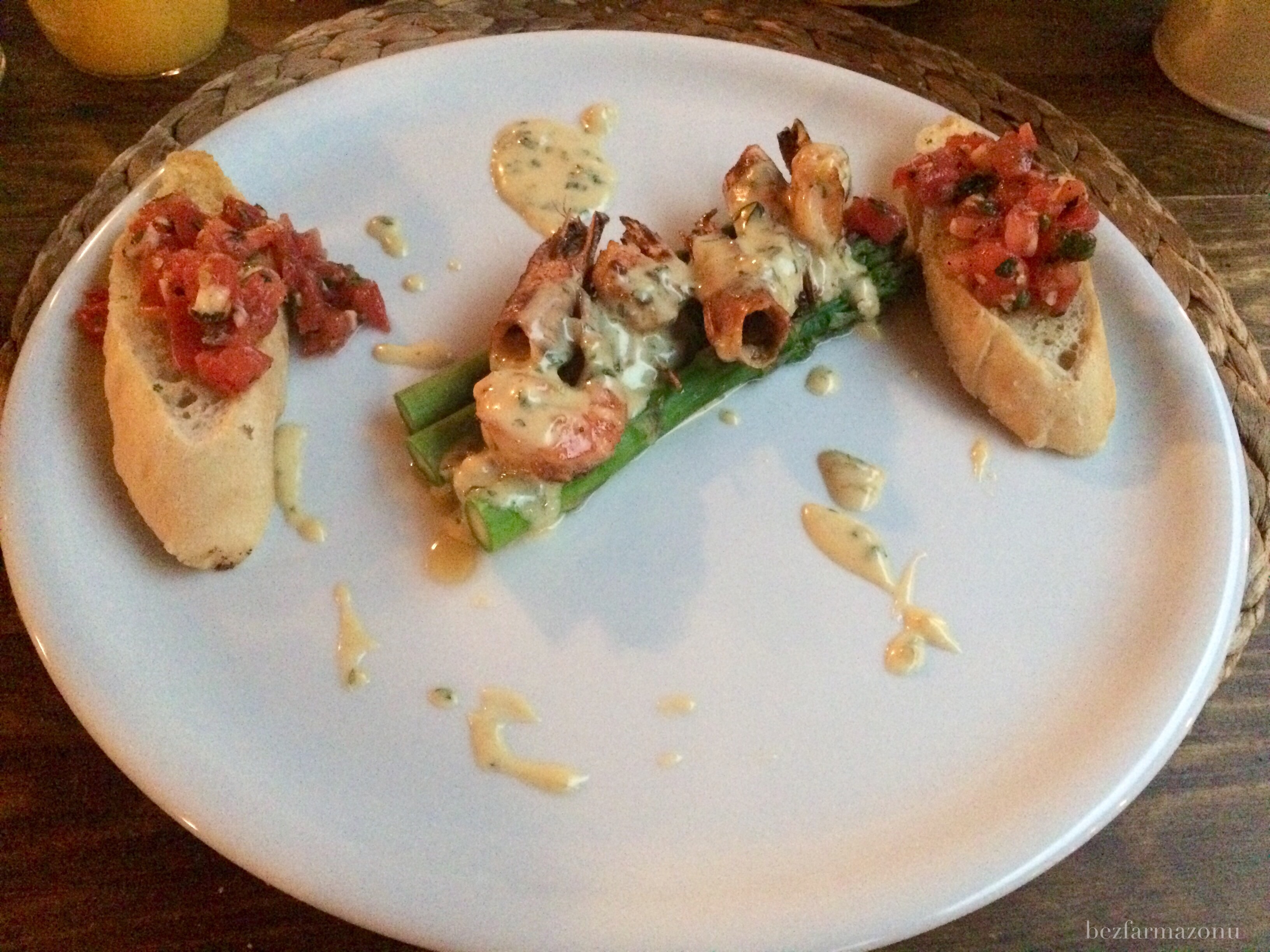 - szparagi z krewetkami podane z pomidorowymi bruschettami 25 PLN – owoce morza polane sosem, szparagi bez twardych części, pieczywo chrupiące i dzięki pomidorom z bazylią wyraziste;