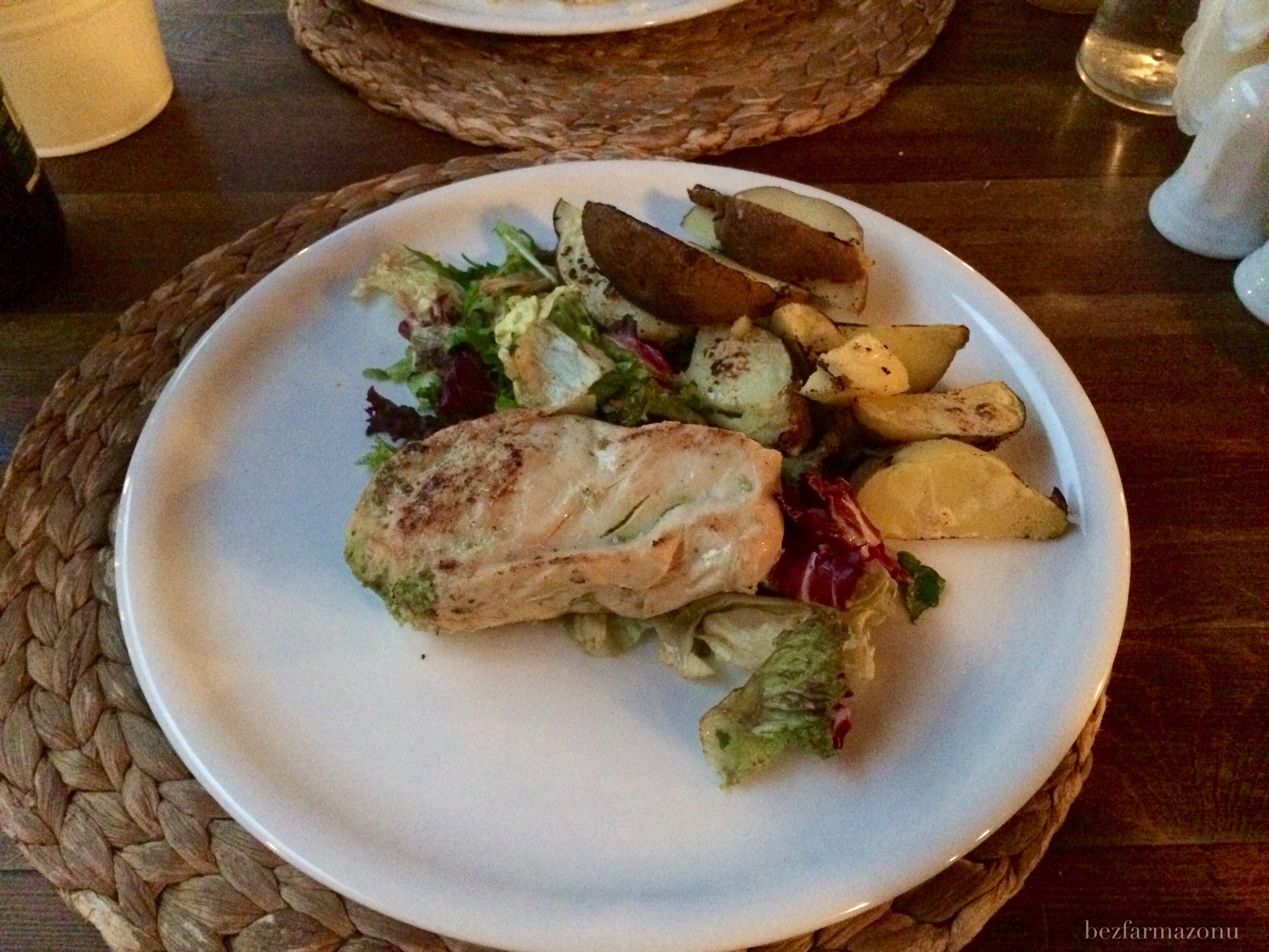 - pierś kurczaka nadziewana ricottą i pesto bazyliowym wraz z opiekanymi ziemniakami 27 PLN – dzięki przygotowaniu metodą sous vide (o czym powiedziała nam kelnerka – przy tym konkretnym daniu nie jest to zaznaczone w menu) kurczak był bardzo delikatny, soczysty i lekki. Farsz w porządku – nie urzekł mnie jakoś specjalnie. Mistrzami na talerzu były natomiast ziemniaki. Proste danie, które łatwo można schrzanić. Często mimo opisania w karcie jako pieczone podawane są smażone – tutaj było tak jak trzeba. Owe ćwiartki ziemniaka smakowały jakby wyjęte były z ogniska, lekko twardawa skórka i nie do końca dopieczone środki – wystarczy szczypta soli żeby przenieść się myślami do czasów wyjmowania takich ziemniaków z ogniska i zajadania jak lekko ostygną. Warzywa przypominały zwykłe pakowane już gotowe i umyte zestawy takie jak spotykamy w marketach.