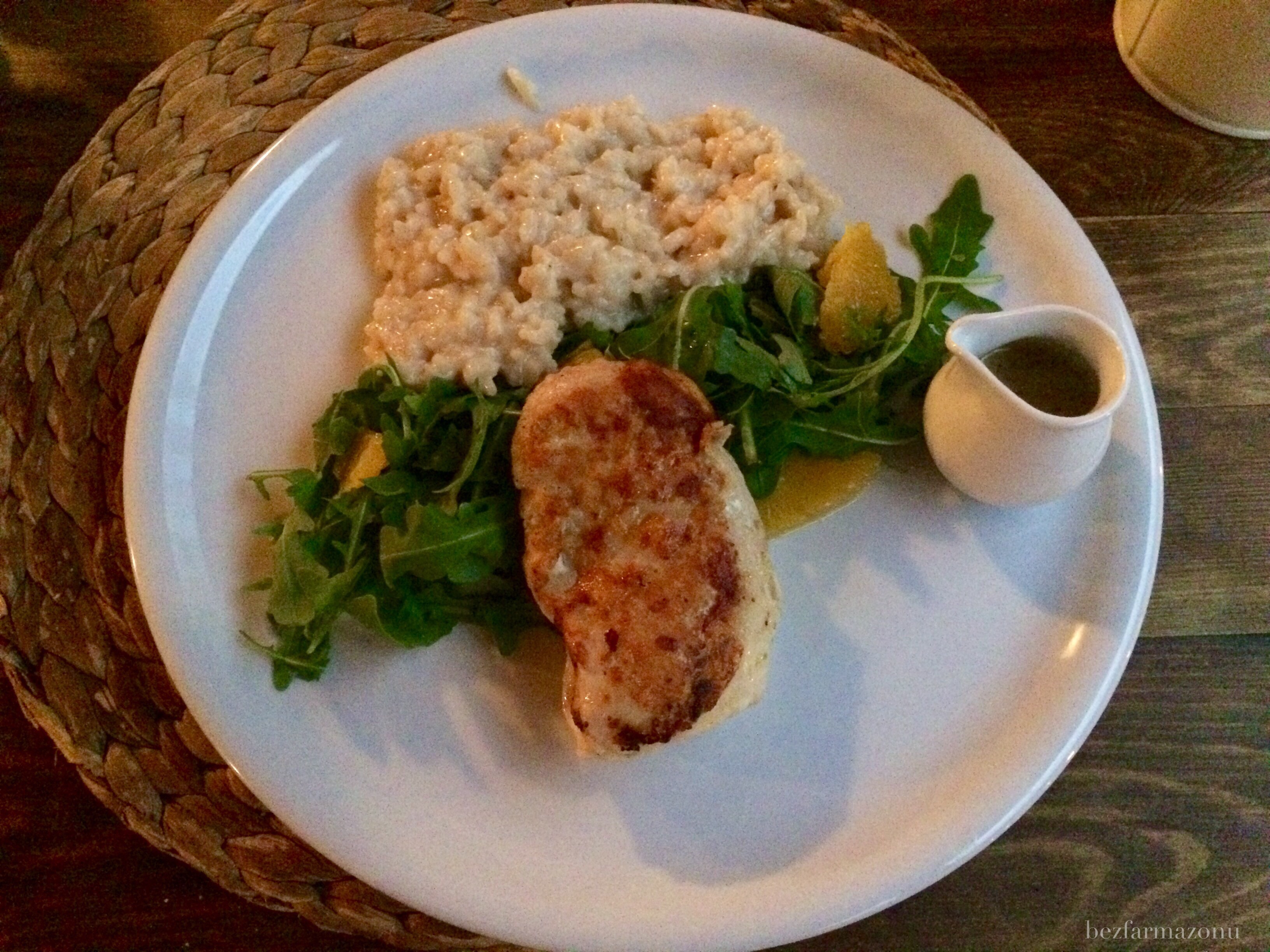 - pierś z kurczaka w parmezanowej panierce podana z cytrynowym risotto wraz z rukolą i sosem vinegrette 25 PLN – mięso również bardzo delikatne, risotto cytrynowe kleiste, sos z dzbanuszka wraz z rukolą w pomarańczach pasował wyśmienicie do całego „zestawu”