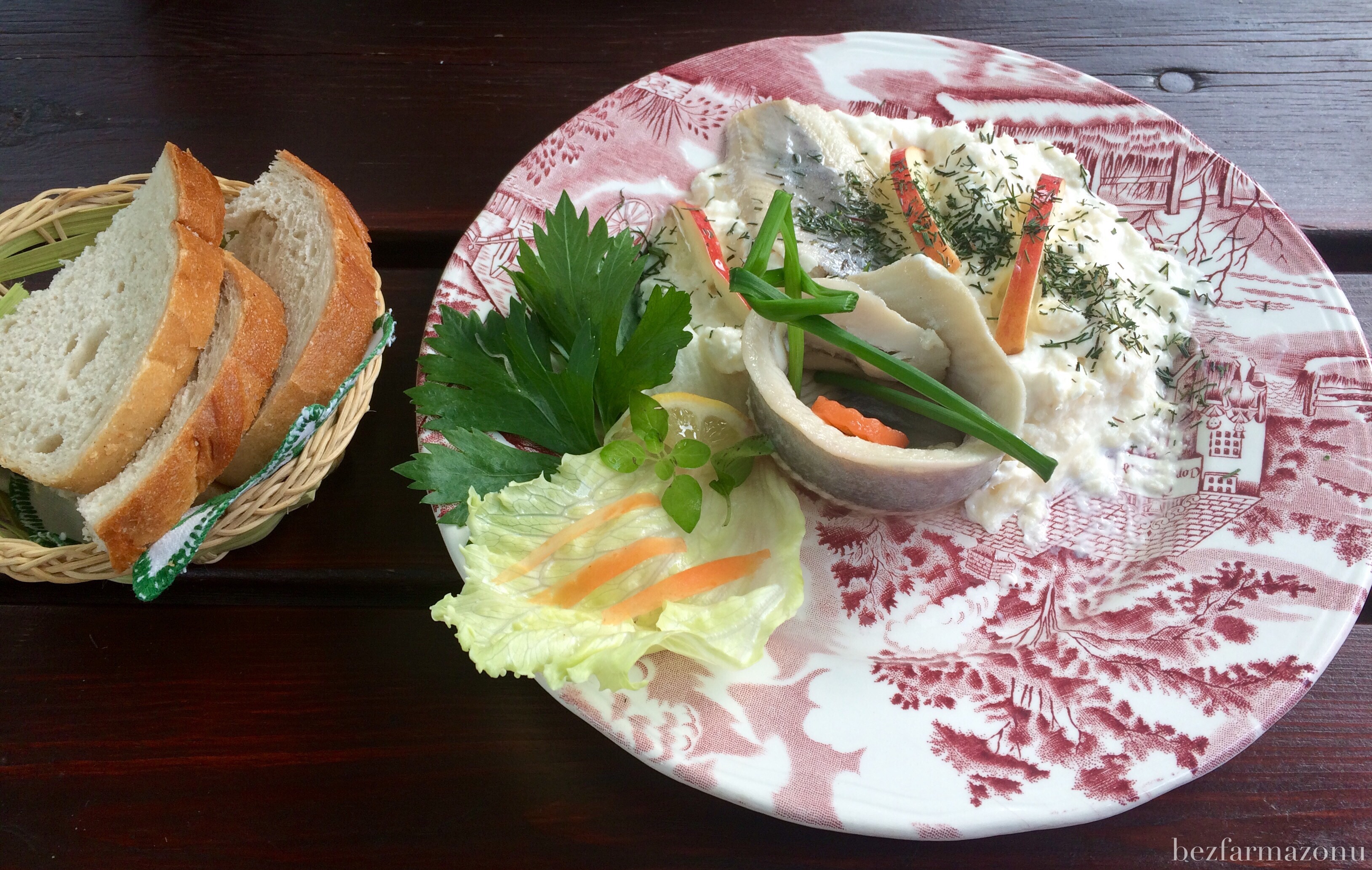 - nie wiem co mnie wzięło ale postanowiłem spróbować śledzia w sosie jabłkowo – chrzanowym 12PLN. Trzy spore kawałki leciutko słonej ryby, sos bardzo dobry wraz z kawałkami jabłek, do tego pare kromek pszennego chleba – super przekąska – polecam