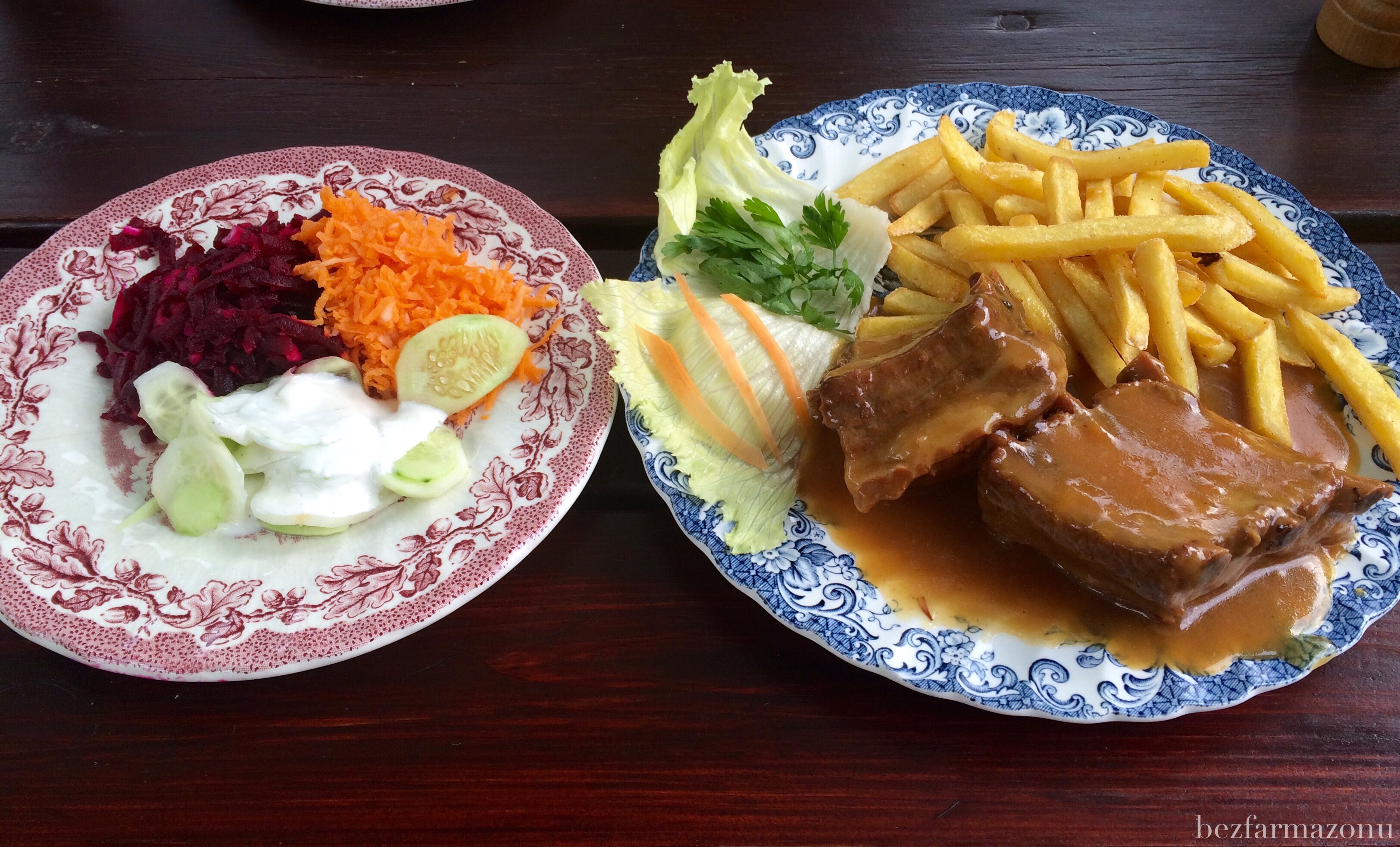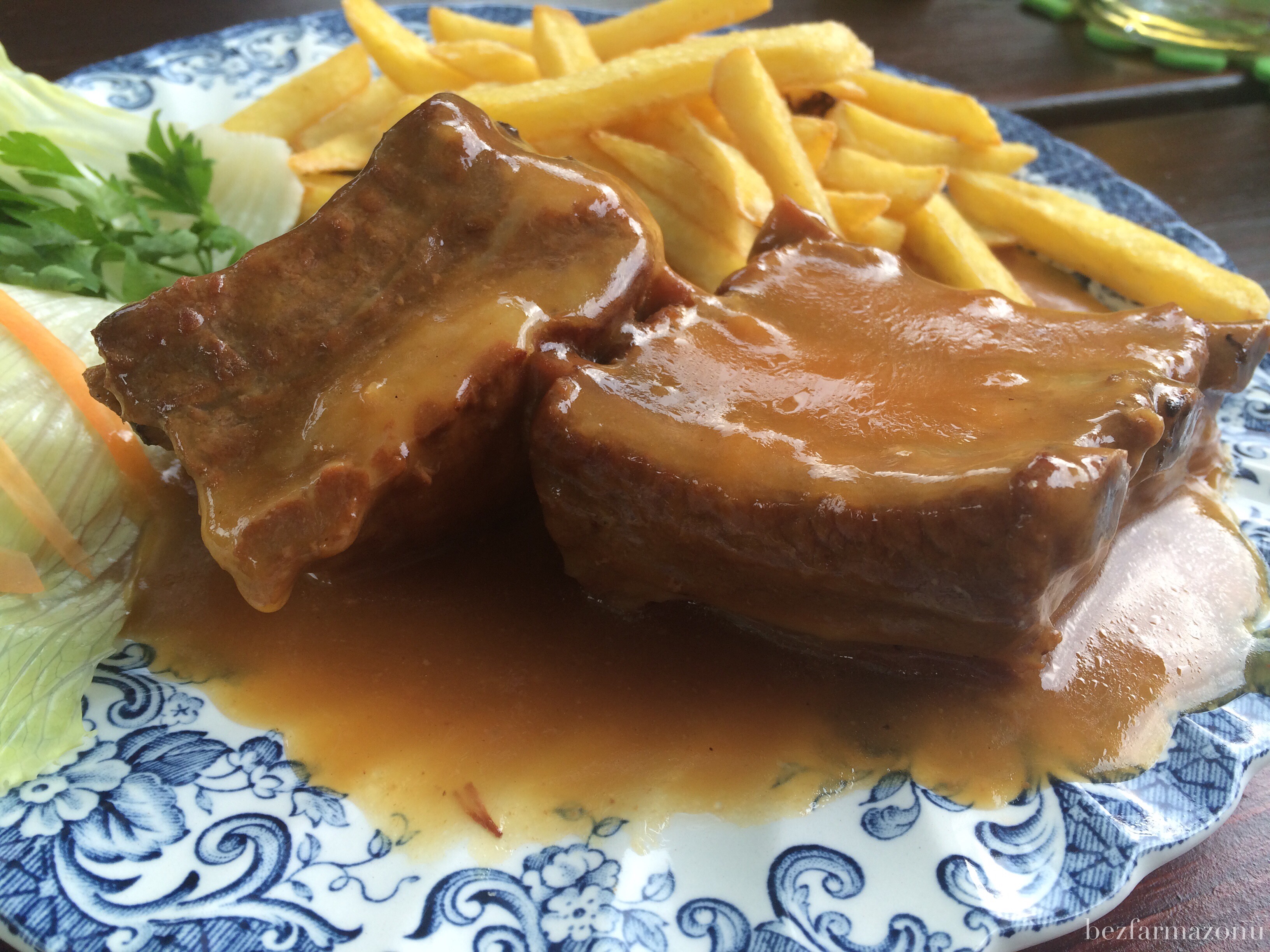 - nigdy ich nie jadam, ale podczas wakacji postanowiłem zaryzykować i zamówiłem żeberka w sosie musztardowo-miodowym z frytkami i zestawem surówek 28PLN. Frytki smaczne i złociste, surówki też ok. Mięso hmm mięsa ogólnie było mało, 1/3 to były kości, a 1/3 to tłuszcz. Wszystko odchodziło ładnie od kostek, sos z żeberek idealnie nadawał się do moczenia w nim frytek. Ciężko i niewygodnie się to jadło – upewniłem się po tej próbie, że nie jestem fanem żeberek.