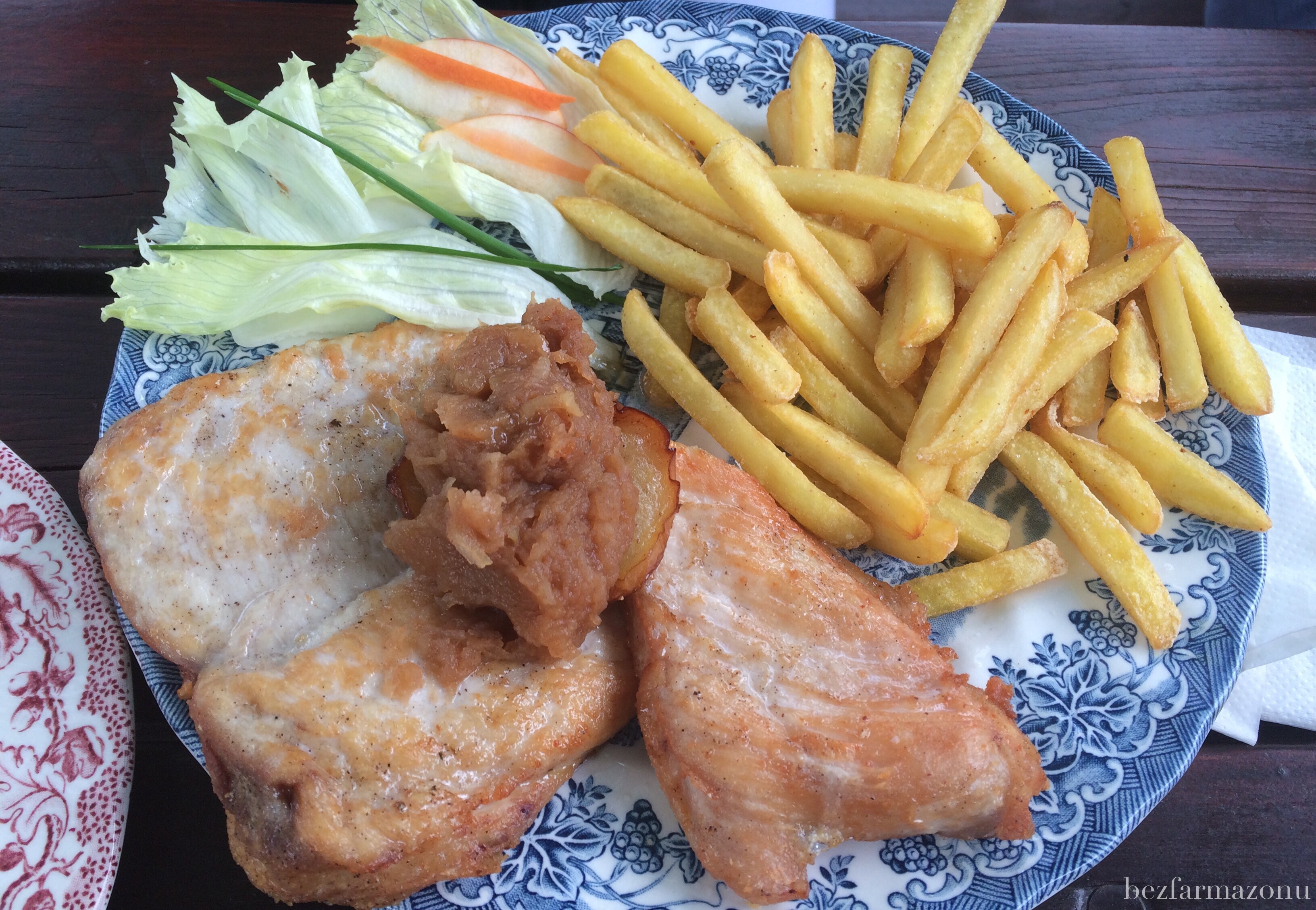 - pierś saute z kurczaka 27PLN z tym samym zestawem dodatków co moje żeberka. Sporo, bo 150g mięsa, które usmażone zostało bez panierki. Dzięki temu było lekkie dla zołądka i delikatne w smaku. Kroiło się w porządku, chociaż jadłem delikatniejsze. Podane ze swieżym musem z jabłek;