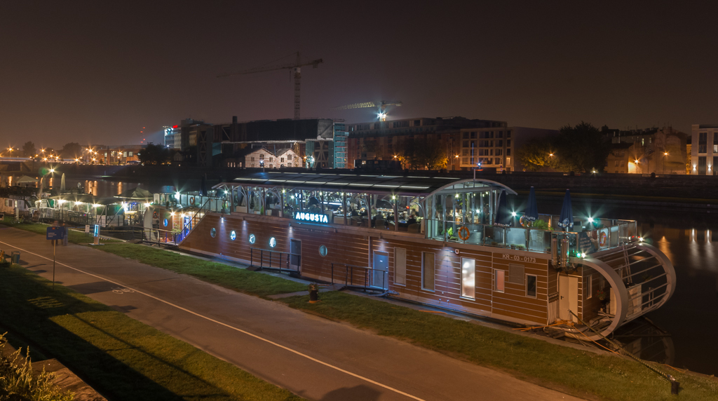 Siedzieliśmy na głównej sali, drzwi na taras były otwarte, a lekki wiaterek wpadał do pomieszczenia, które było dodatkowo chłodzone przez wiatraki na suficie. Nie było ani za gorąco ani za zimno, w przerwie miedzy posiłkami siadaliśmy na tarasie z widokiem na Wisłę i pięknie oświetloną kładkę Bernatka.