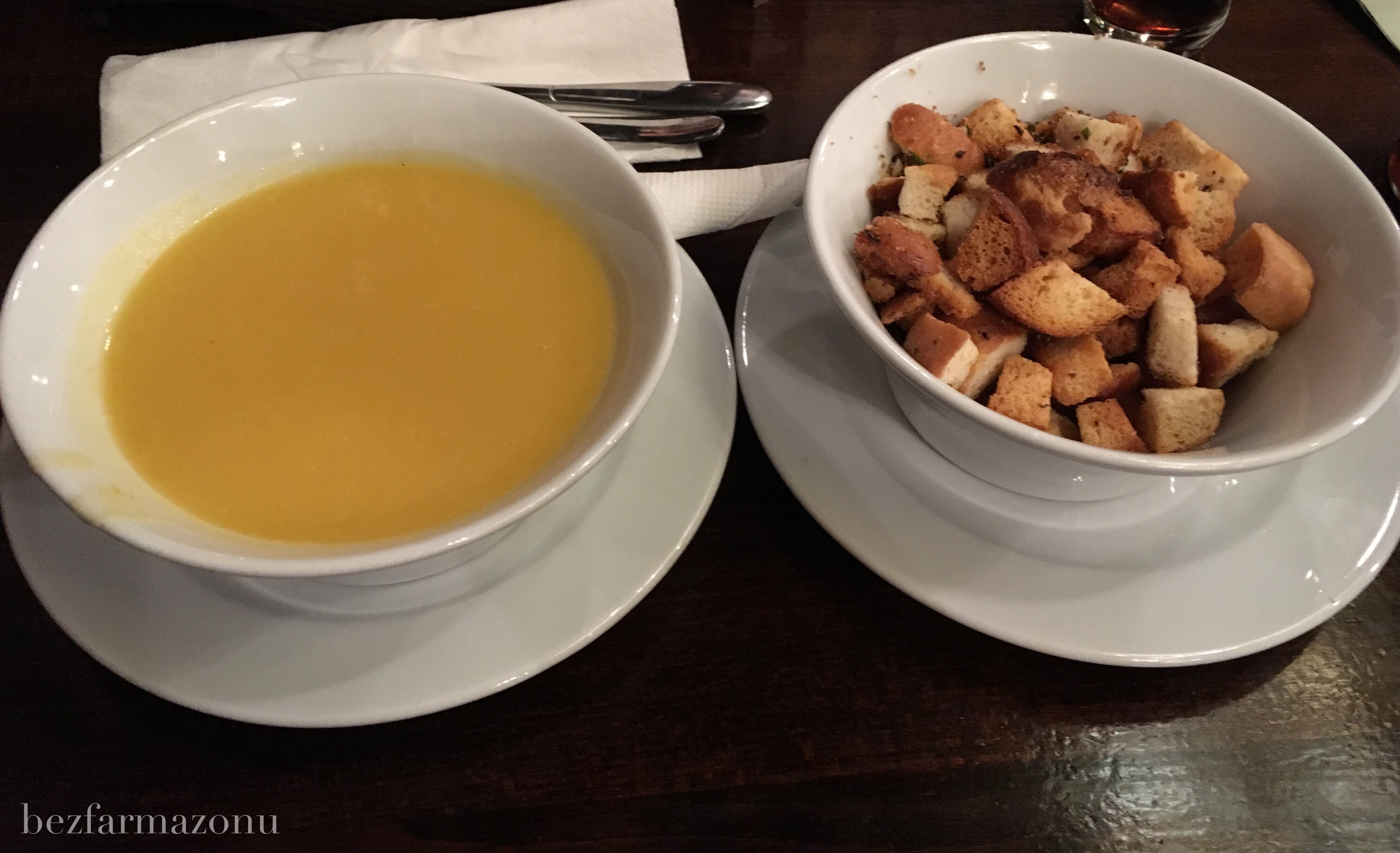 Polecono mi ciorbę z fasolą i wieprzowiną w chlebie. Taki sposób podania specjalnie mnie nie zaskoczył – w końcu w Polsce w wielu miejscach tak podaje się żurek. Smak ciorby super – gęsta i wyrazista, sporo mięsa, gorąca, chlebek-naczynie chrupiący od góry. Spróbowałem też zupy warzywnej – średnio lubię kremowe konsystencje ale ta była serio dobra, ciepła i intensywna a grzanki delikatnie czosnkowe – same w sobie idealne na przekąskę.