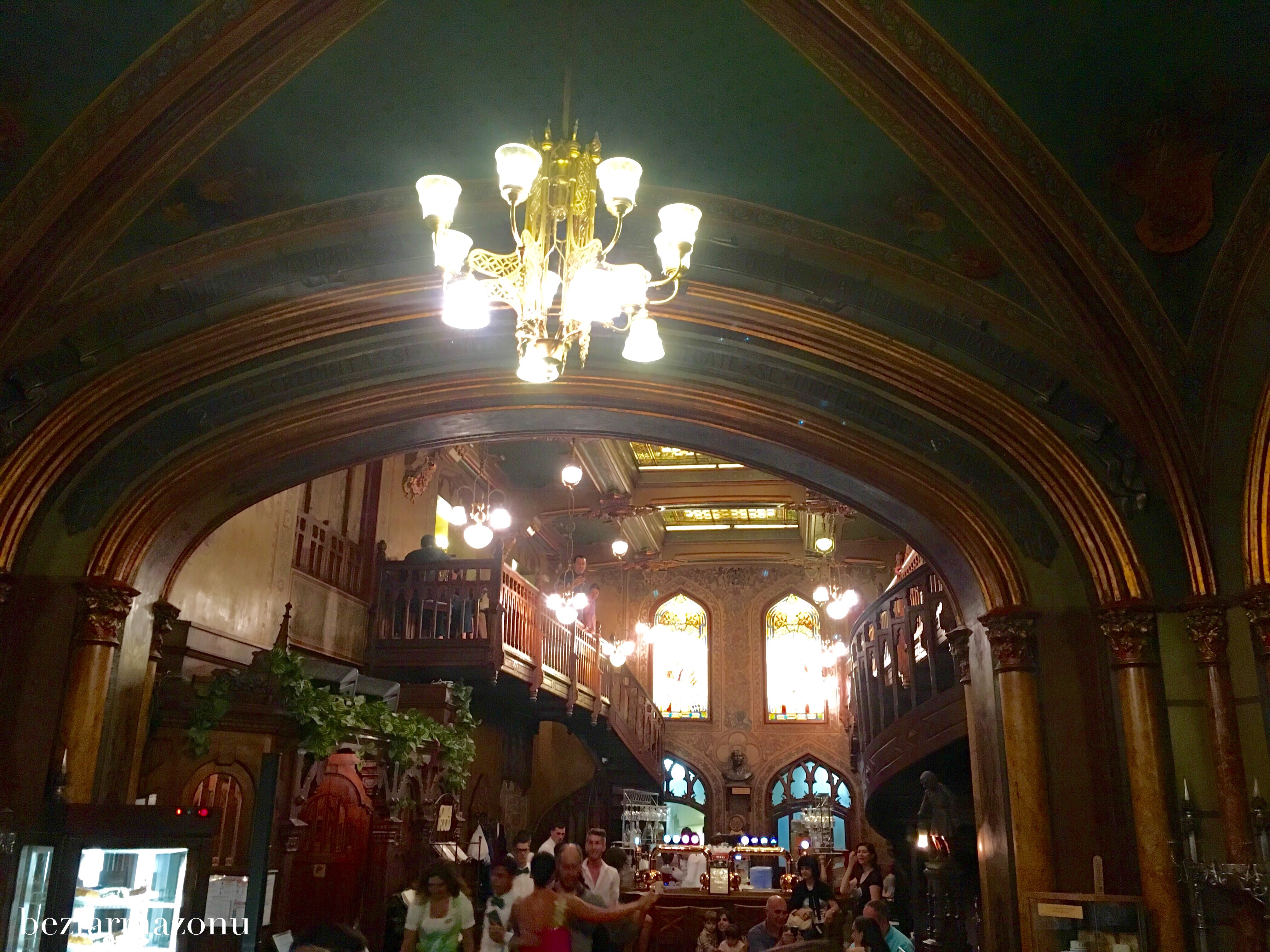 Przyznaję, że dla mnie wystrój lokalu nie ma jakiegoś wielkiego znaczenia ale owszem zdarzają się perełki – to była jedna z nich. Pierwsze wzmianki o tym miejscu są już z roku 1879 kiedy powstała tu warzelnia piwa (i dalej jest). Teraz trwają prace nad odrestaurowaniem całej zewnętrznej fasady. No dobra, co widzimy po przekroczeniu drzwi wejściowych? Moje ajfonowe zdjęcia w ogóle nie oddają klimatu – zainteresowanych zapraszam na stronę www podaną na końcu postu.