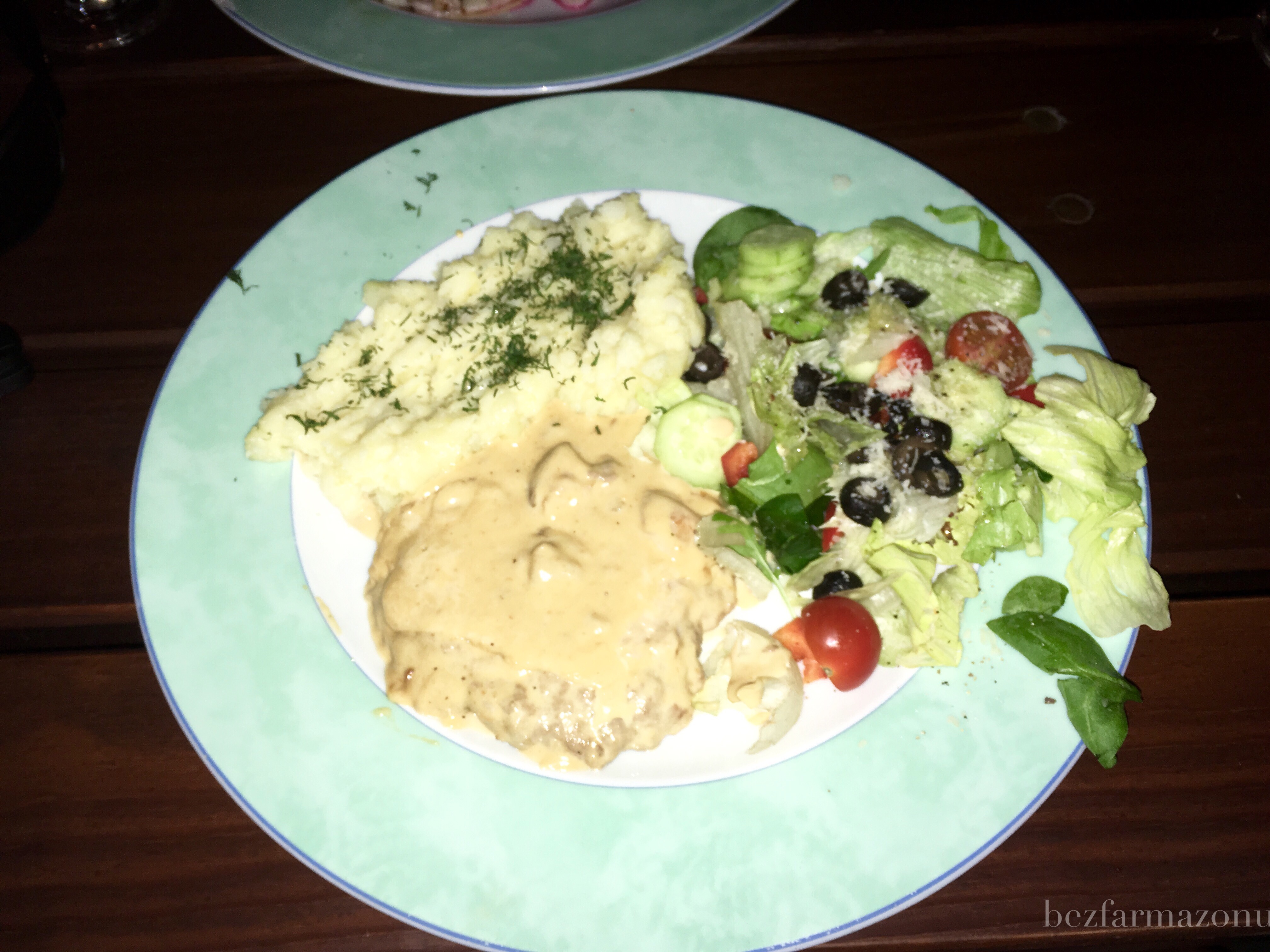 Zamówienia składamy przy barze i od razu płacimy. Pokusiłem się na cielęcinę w sosie borowikowym z ziemniakami puree i mixem sałat – 25PLN. Mięso było miękkie, ale porcja nie powalała wielkością. Ziemniaki i sałaty, niczego szczególnego o czym warto byłoby napisać, nie wnosiły do całości.