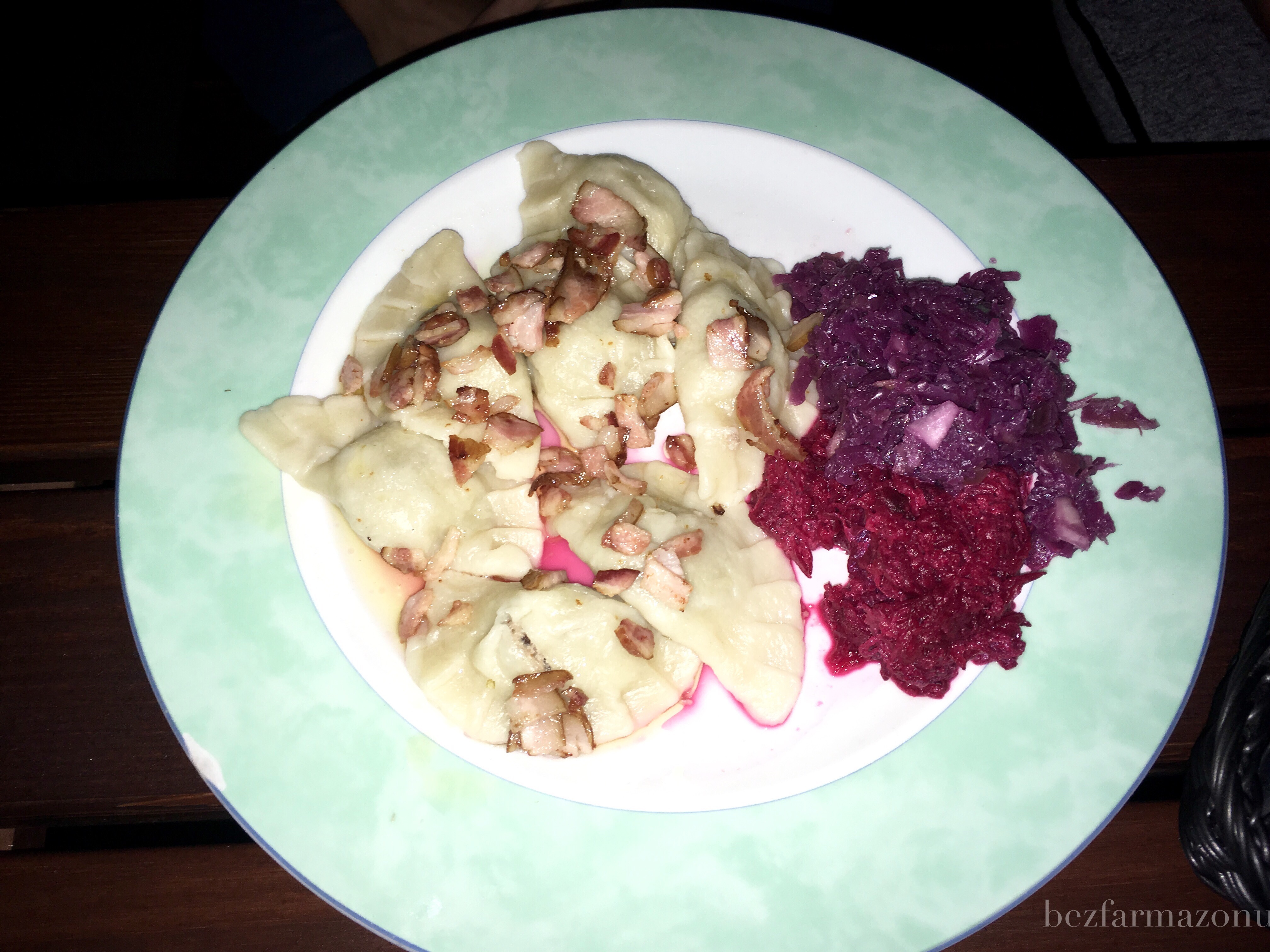 K. chciała pierogi ruskie, ale chwilę po złożeniu zamówienia pojawiła się kelnerka, informując nas, że ruskich nie ma. Wybór padł więc na pierogi z mięsem – 12PLN. Okazały się tragiczne. Farsz mięsny niesmaczny, ciasto takie sobie, surówki całkowicie niejadalne. W ogóle wystarczy spojrzeć poniżej jak to wyglądało. Pierogi pływały w wodzie z buraczków i czerwonej kapusty i nimi przesiąkły. No mega lipa.