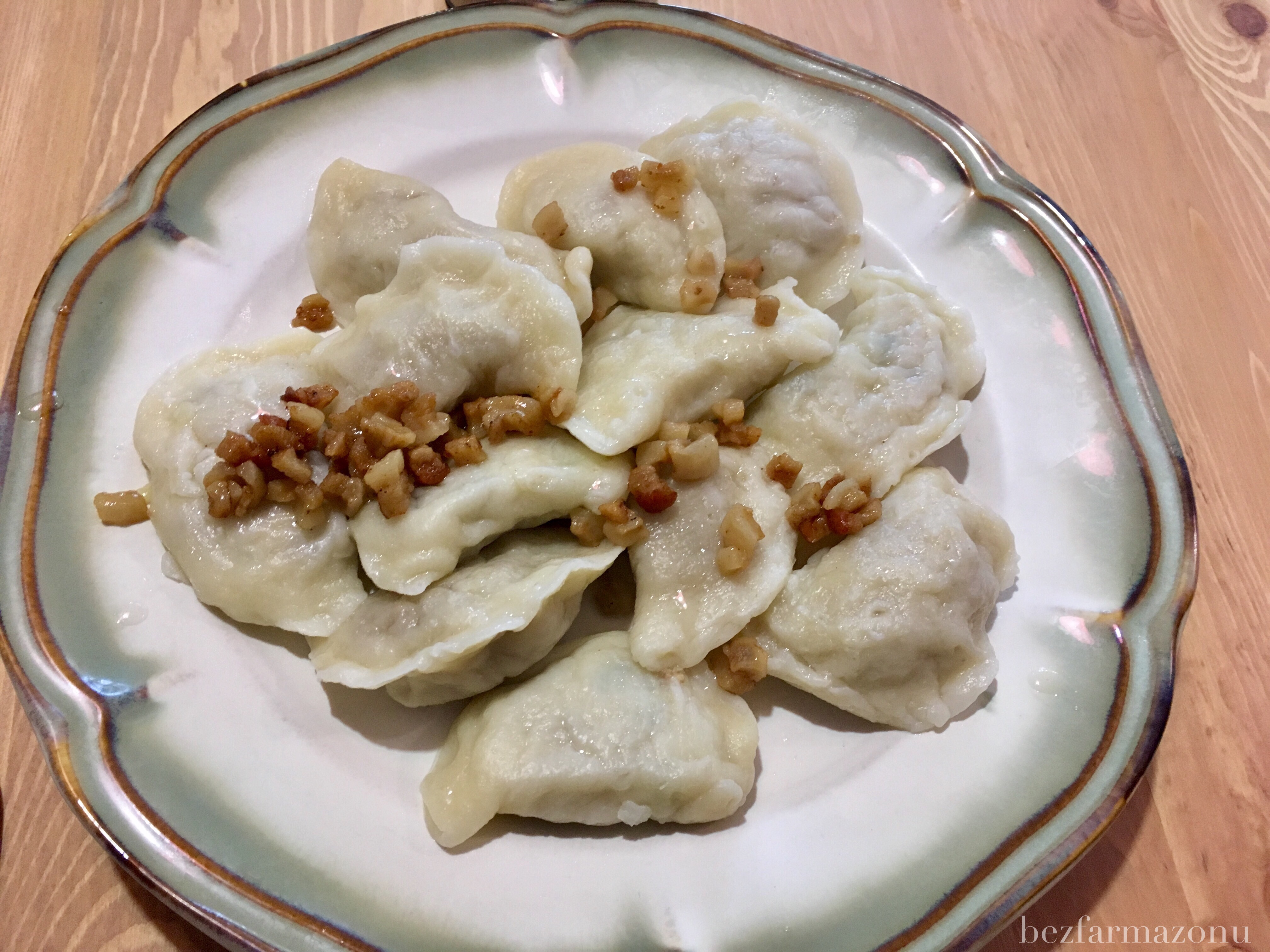 Pierogi były świeże, dobrze sklejone, nierozgotowane, sprężyste. Ciasto było w sam raz, a mięsne farsze z dodatkiem pietruszki bardzo dobrze smakowały. Okrasa w formie skwarek była strzałem w 10tkę. Pierogi nie pływały w tłuszczu, a same skwarki były idealnie chrupiące i pachnące.
