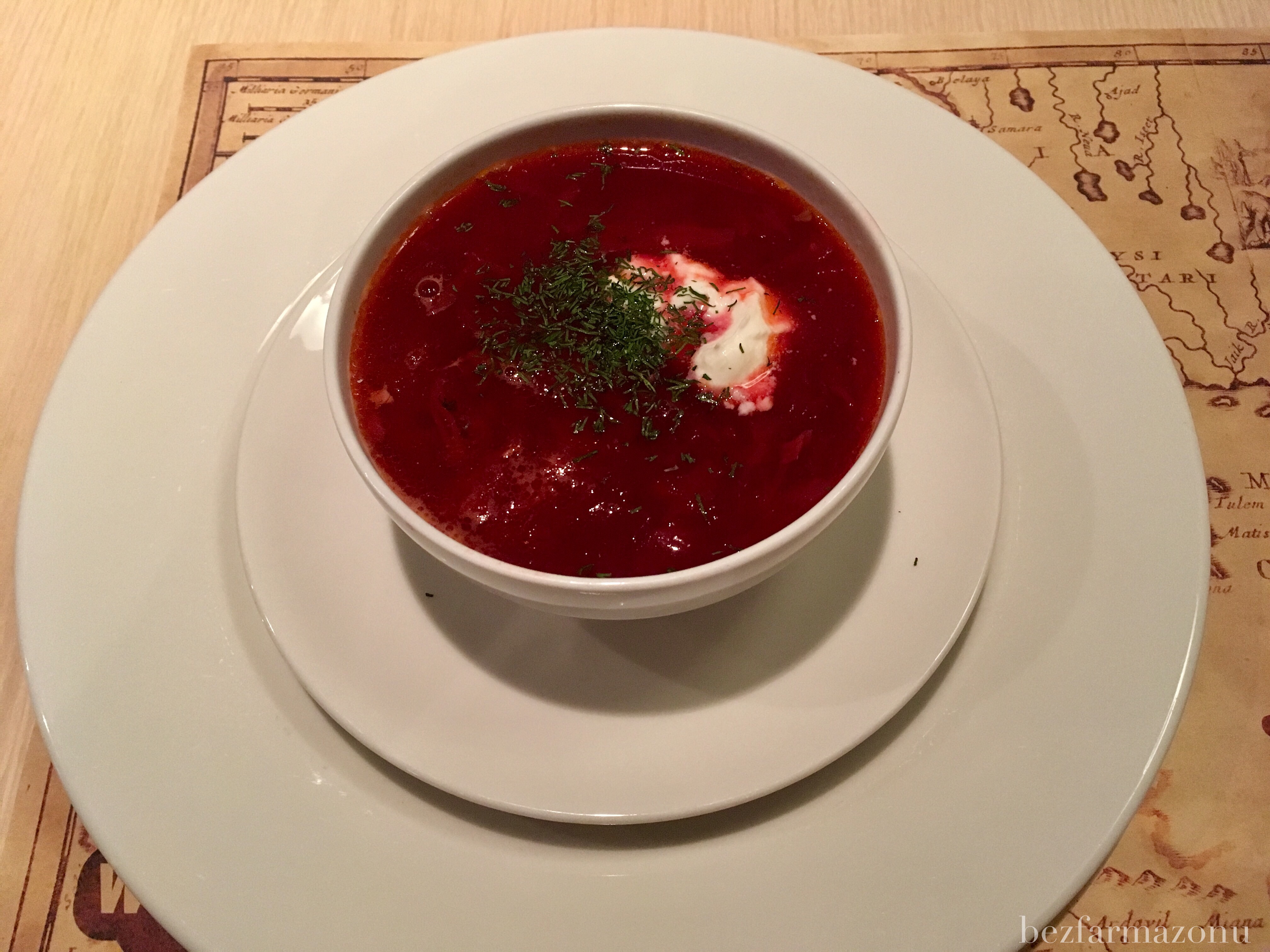 - barszcz ukraiński 16PLN – zupa przypominająca polski czerwony barszcz, lekko słodka, z dodatkiem śmietany i małym kawałkiem boczku,