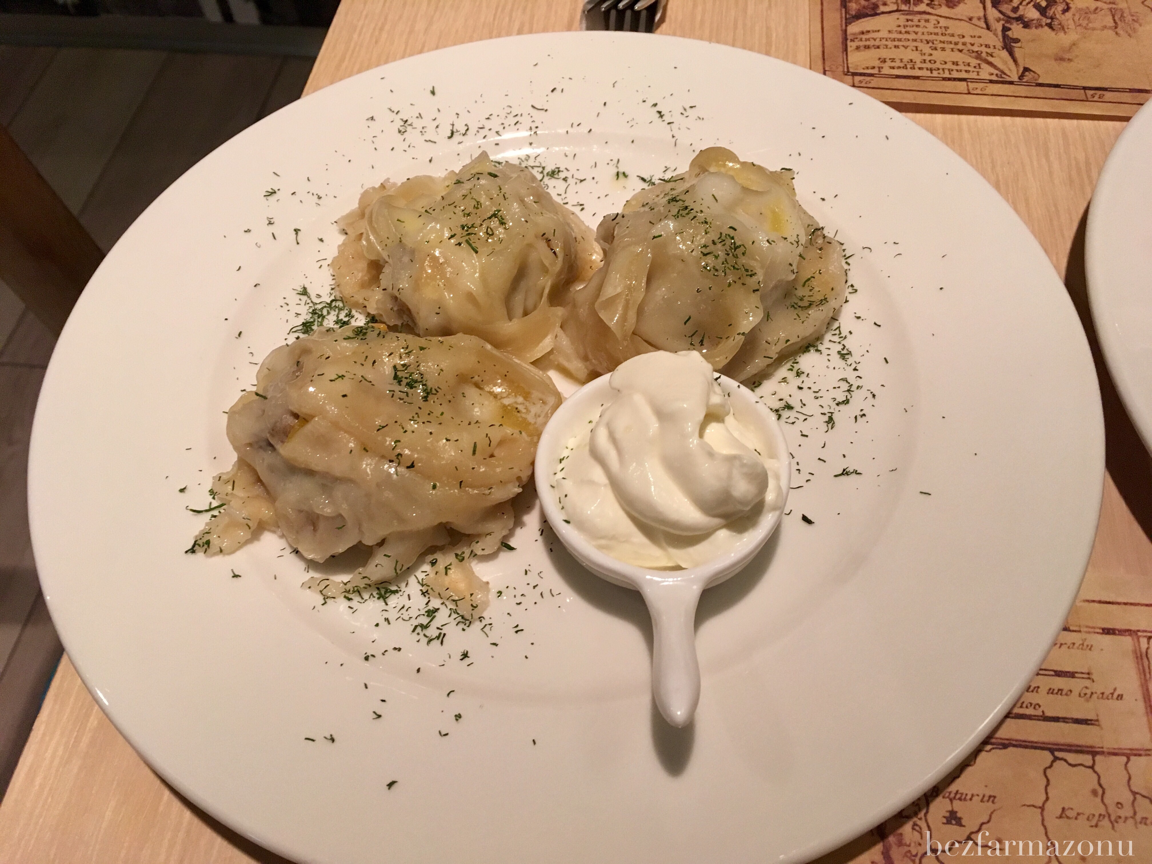 - manty 11PLN – 3 sztuki bardzo miękkich i aromatycznych gotowanych pierożków ze smacznym farszem z mielonego mięsa wołowego oraz z dynią. Podane zostały z super dobrą, kremową śmietaną, lekko polane masłem.