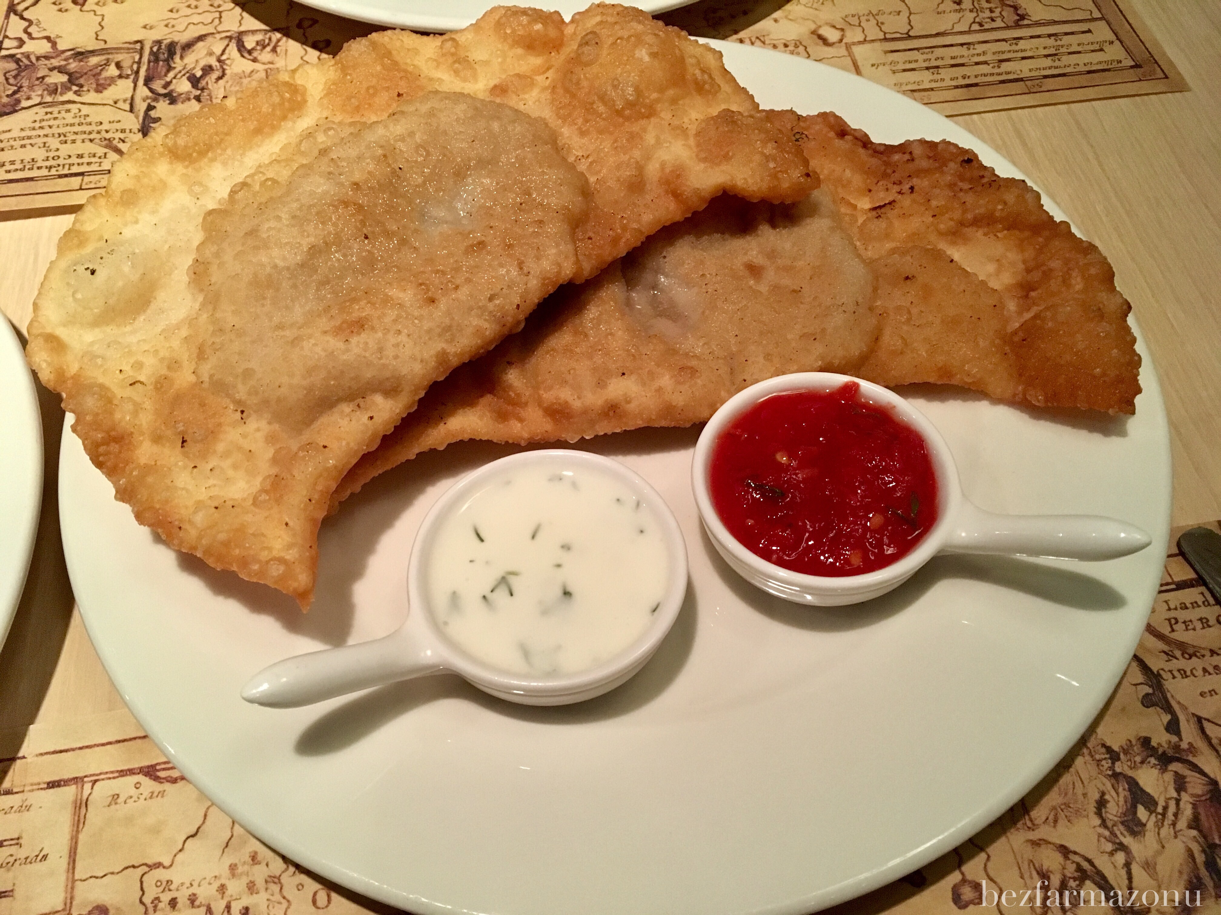 - czebureki 14PLN – bardzo przyjemnie chrupiące ciasto drożdżowe usmażone w głębokim oleju.Wypełnione były wołowym mięsem mielonym, podane wraz z dwoma sosami;