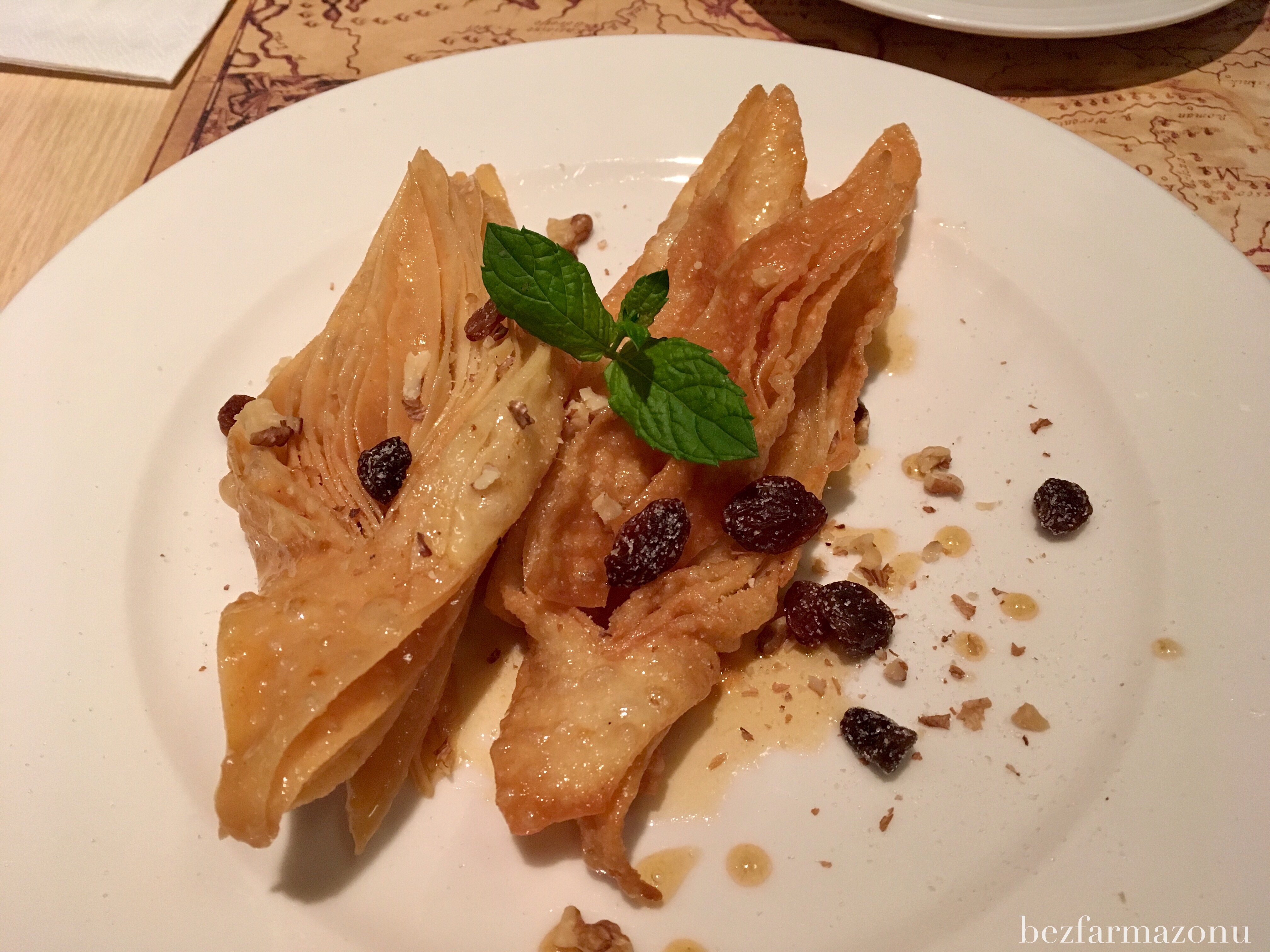 - na deser spróbowaliśmy pahlavy 12PLN. Polane sporą dawką miodu i posypane paroma rodzynkami twarde ciasto usmażone w głębokim oleju. Jak łatwo się domyślić było bardzo słodkie i zdecydowanie wystarczające na dwie osoby;