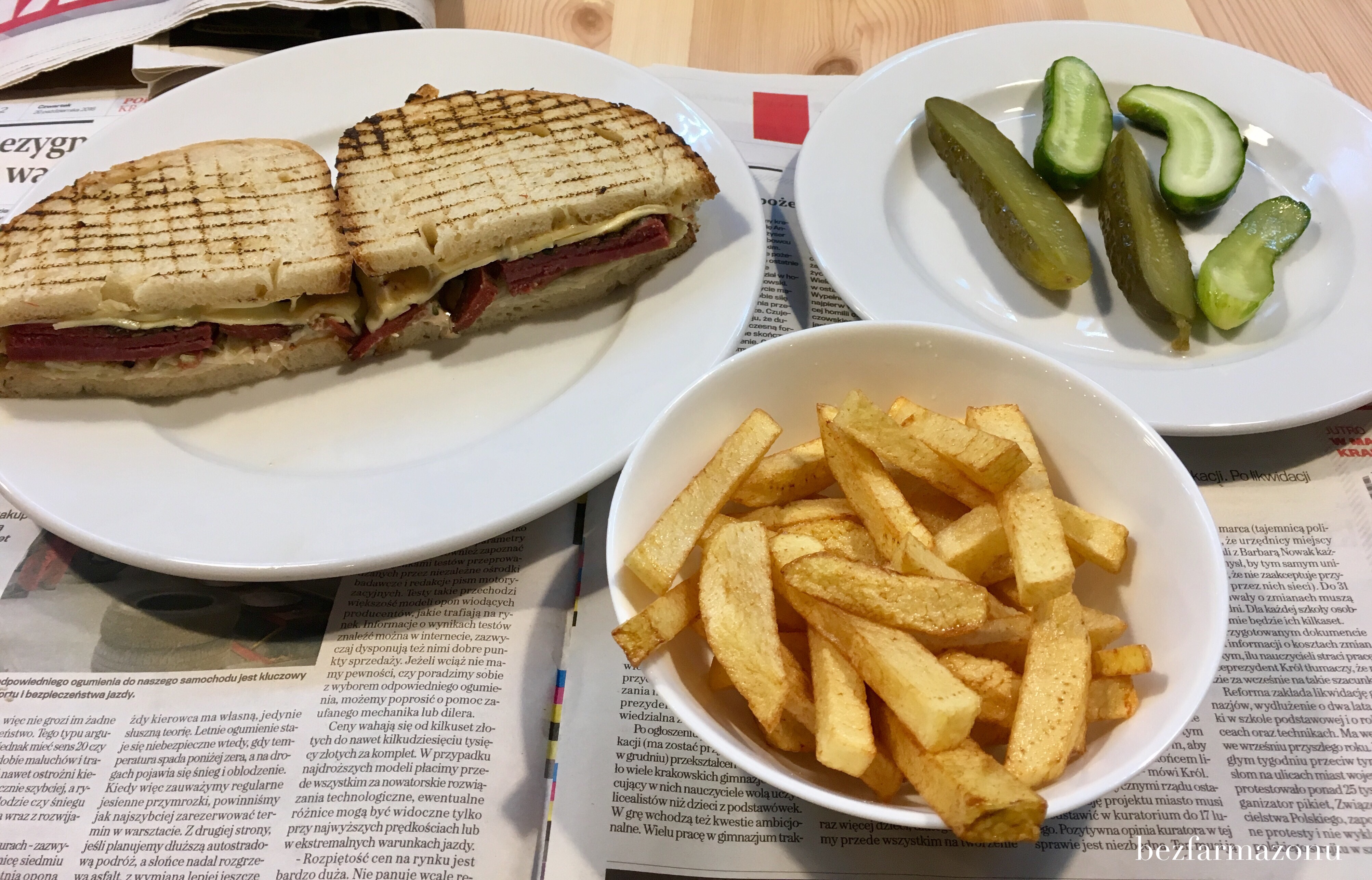 Na start postanowiłem spróbować Reubena (25 PLN) z domowymi frytkami (8 PLN) + piwko w promocji za 4 ziko.