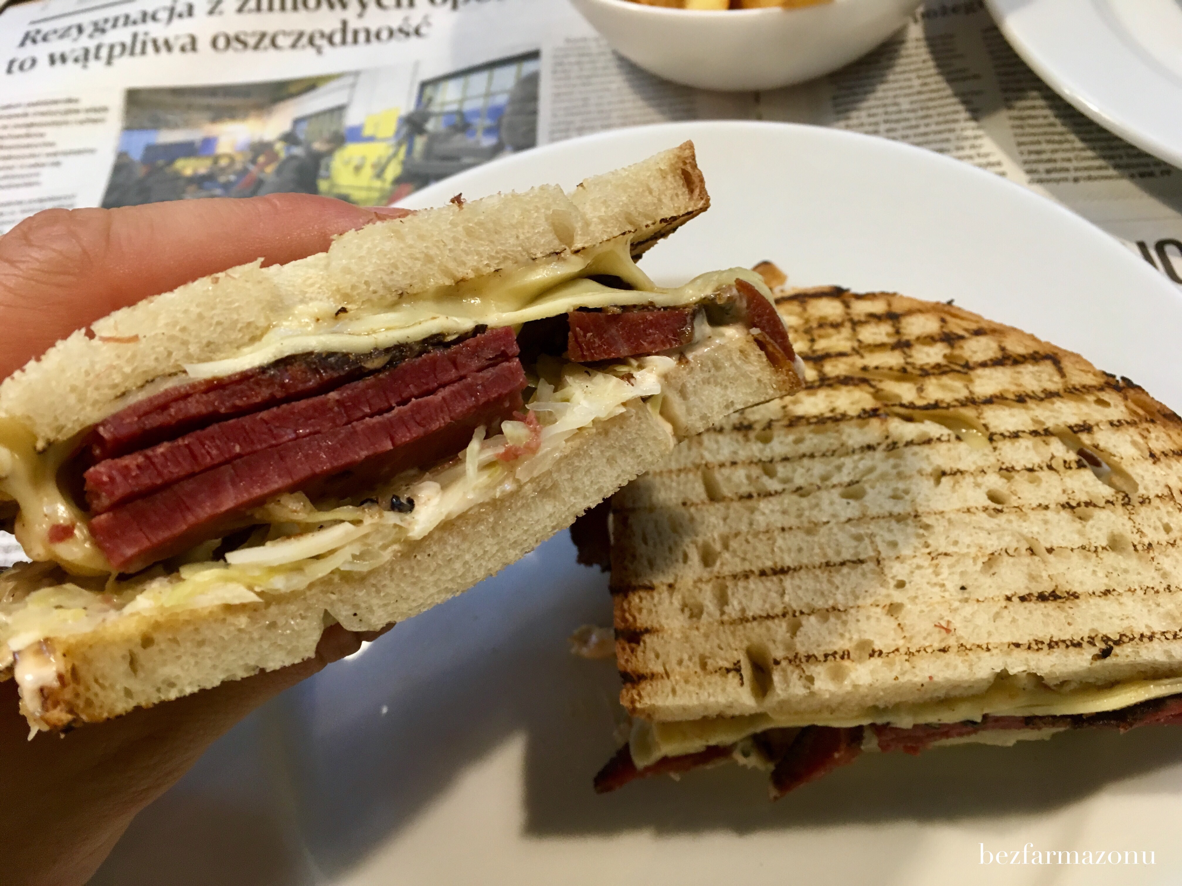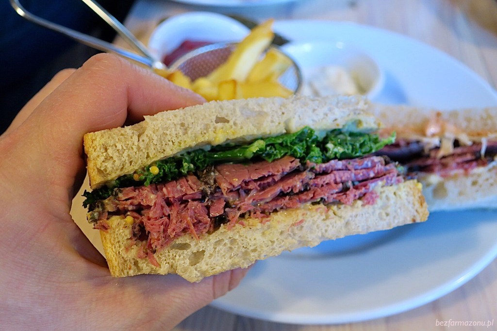 Po przestudiowaniu menu zamawiamy Reubena i kanapkę z jarmużem. Obydwie ze 120 gramami pastrami oraz w tej samej cenie 25 złotych.