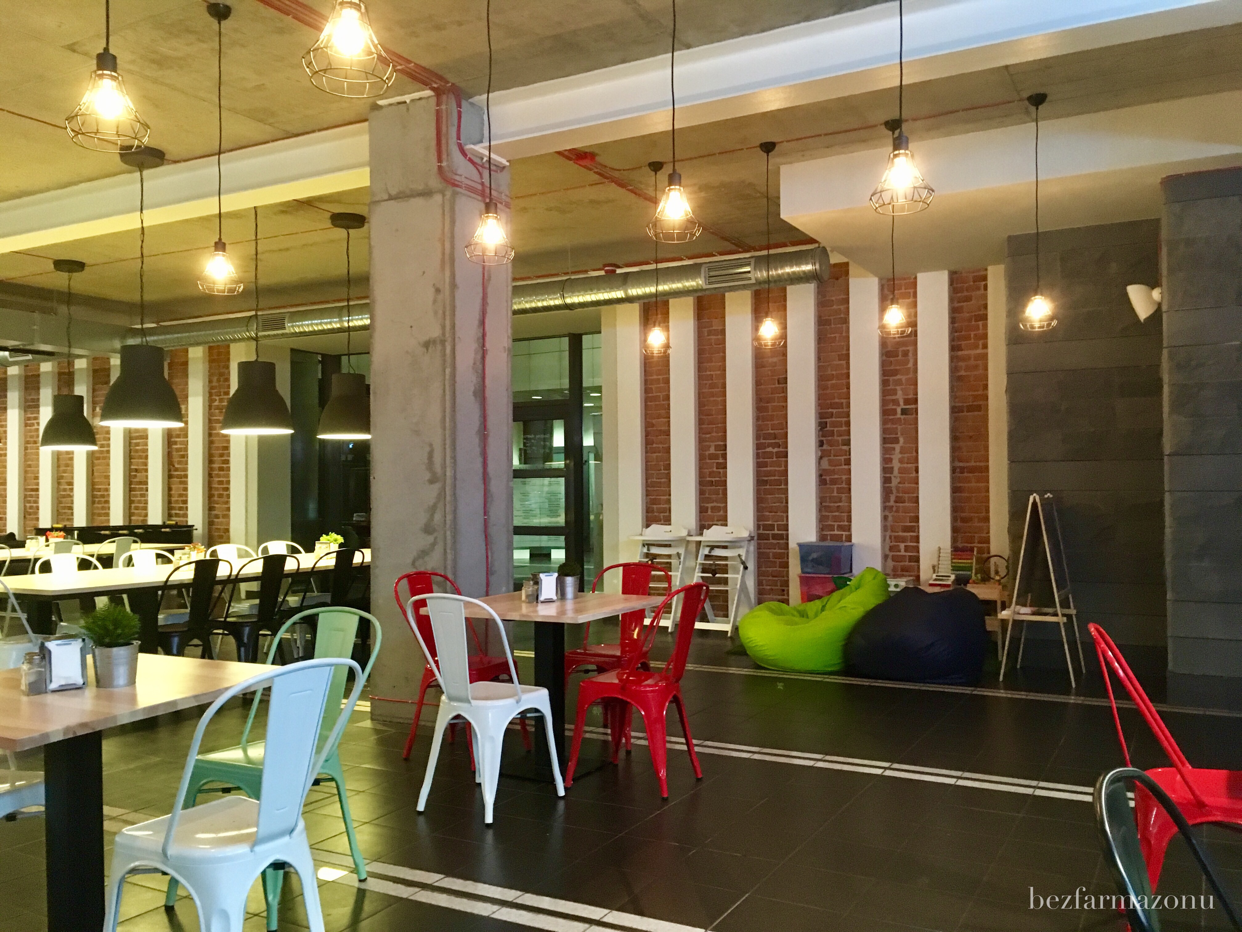 - ogólnodostępna restauracyjno – jadalna, gdzie znajdują się zarówno małe, prywatne stoliki, jak i strefy odpoczynku z pufami czy wygodne większe stoły z powodzeniem mieszczące paręnaście osób;