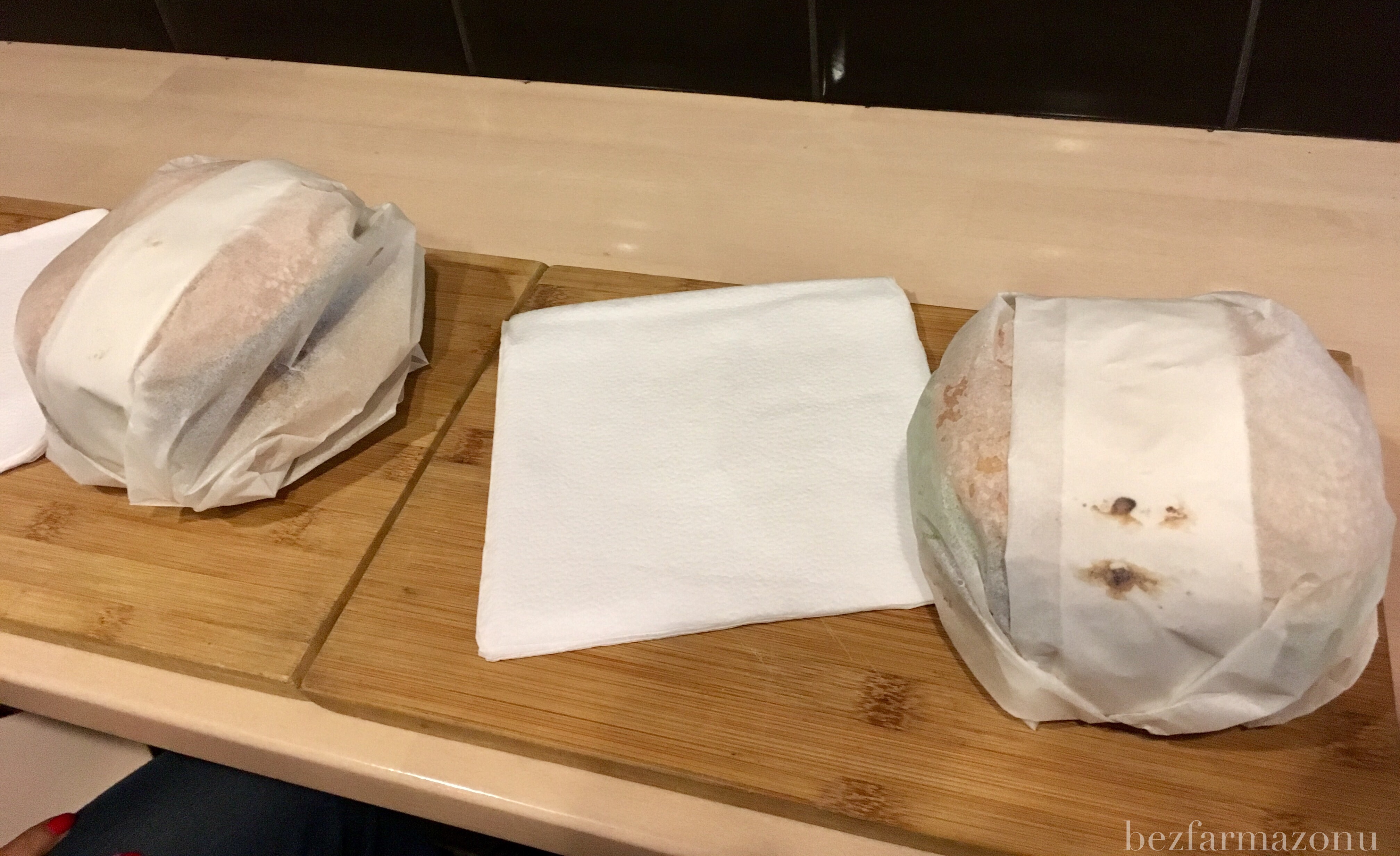 Spróbowaliśmy Classica 17 PLN oraz Frencha 21 PLN z serem gorgonzola oraz chutneyem cydrowo – gruszkowym. W środku nie było nikogo, więc zamówione buły dostaliśmy na drewnianych deskach po 10 minutach.