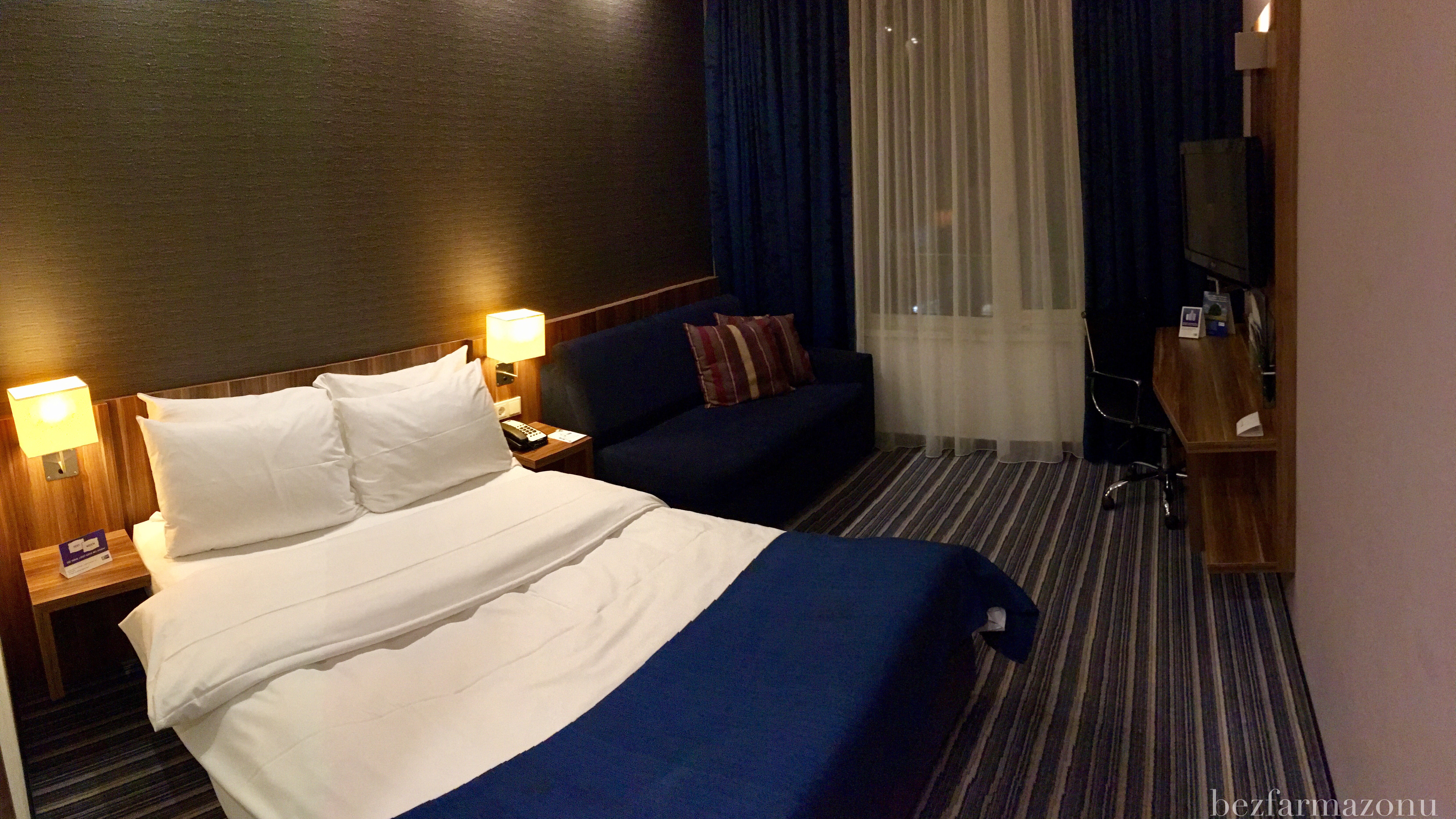 POKÓJ: bardzo czysty, wystarczających rozmiarów z wygodnym ok 160cm szerokim łóżkiem z miękkim materacem. Goście mają do dyspozycji czajnik, saszetki z kawą/herbatą, sejf, TV z ponad 50 kanałami które maja takiego laga przy przełączaniu, że chcąc przejrzeć cały repertuar trzeba by mieć ze 30 minut. Brakuje minibarku/lodówki. Pokój jest idealnie wyciszony, ciemne zasłony w dzień nie przepuszczają światła – można porządnie się wyspać. Ciekawe było to, że na 6tym piętrze dało się całkowicie otworzyć okno