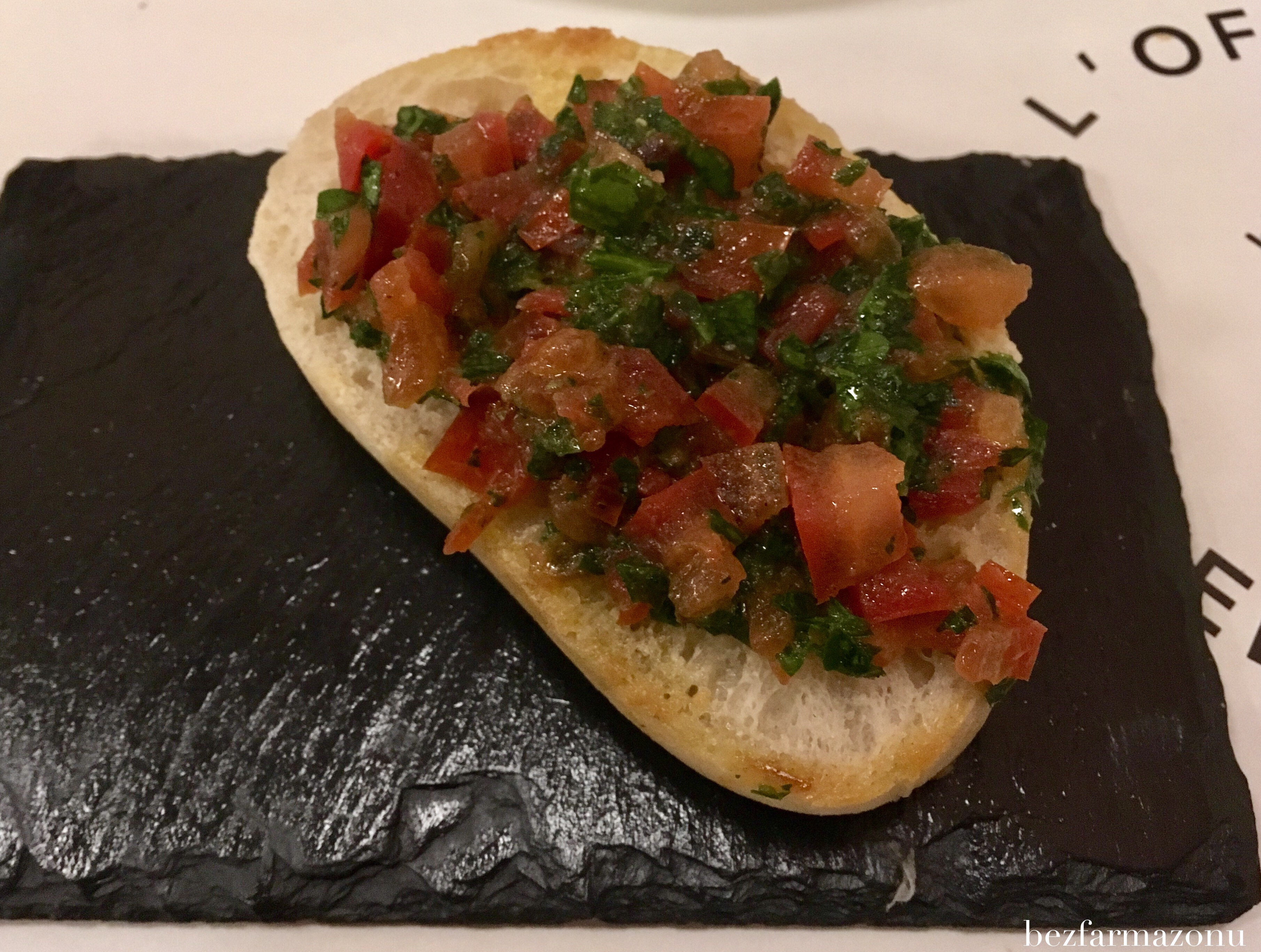 Kilka minut później otrzymaliśmy czekadełka – każdy po jednej sztuce na własnej (chyba granitowej) tacy. Chrupiąca, szkoda że zimna bułka z intensywnymi, miękkimi pomidorkami i pietruszką rozbudziła nasz apetyt.