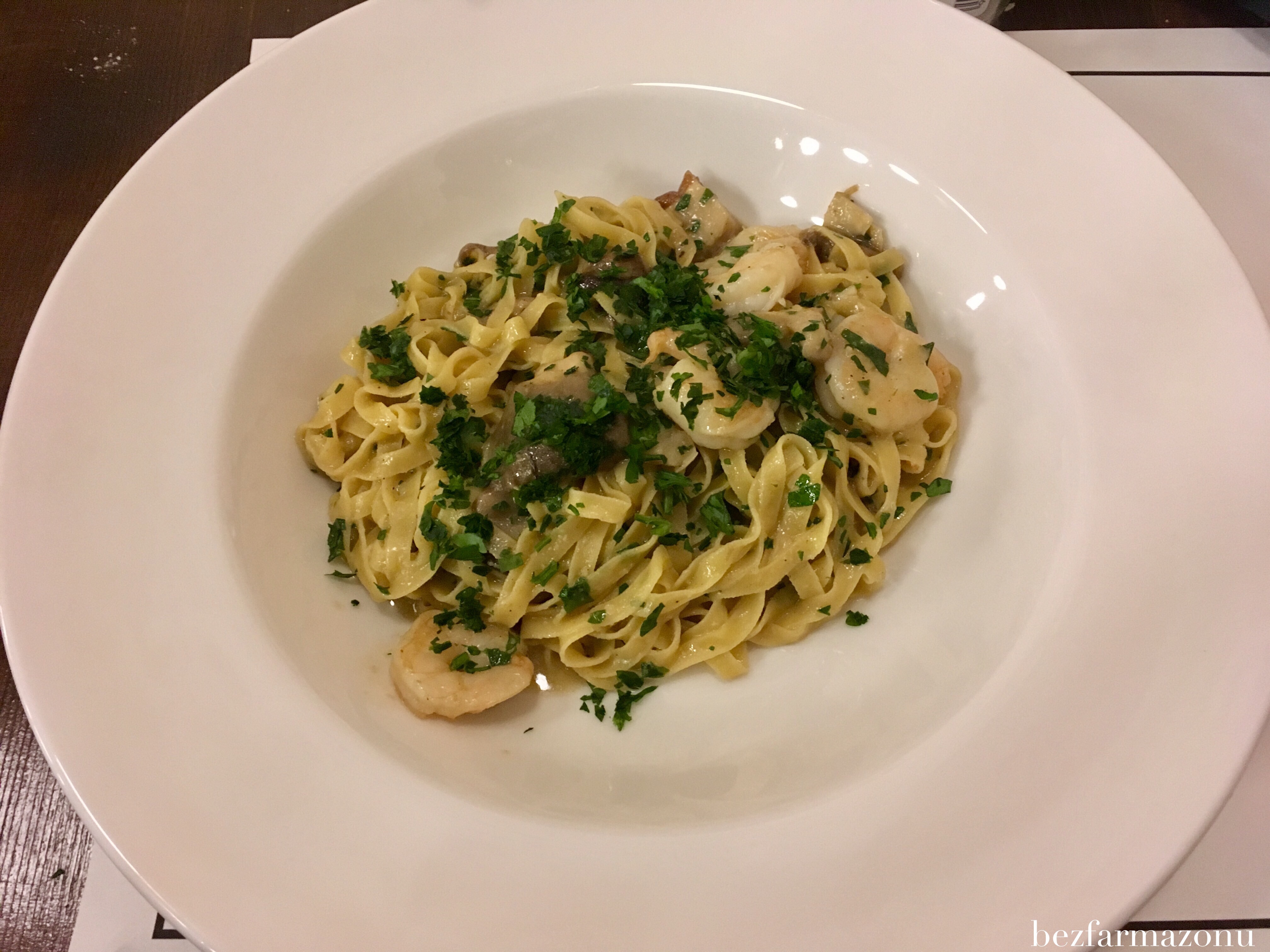- sprężysty, ugotowany al-dente makaron z prawdziwkami i krewetkami w białym winnym sosie (38PLN) – warto przy okazji tego dania zaznaczyć, że zmiana kształtu pasty z oryginalnego scialatielli na preferowany przeze mnie tagliatelle nie była najmniejszym problemem. Krewetki były takie jak najbardziej lubię czyli twardawe i przyjemnie pachnące czosnkiem i pietruszką. Grzybki miękkie i bez jakichkolwiek ziarenek piasku, sosik było dobrze czuć, a jednocześnie danie w nim nie pływało – bardzo poprawnie;